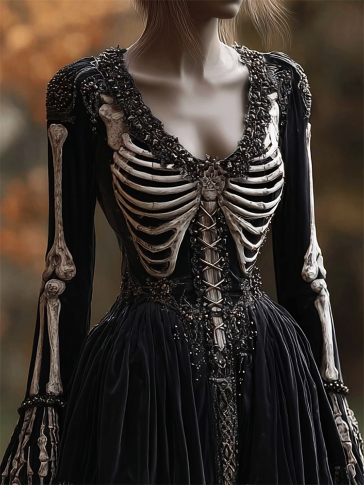 Vintage Skeleton Anatomy Beaded Classy Velvet Maxi Dress