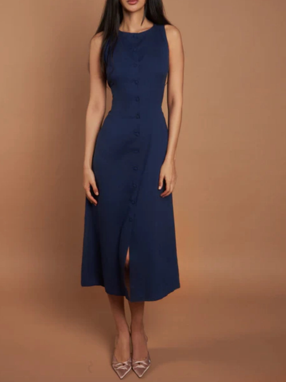 Navy Sleeveless Button Midi Dress