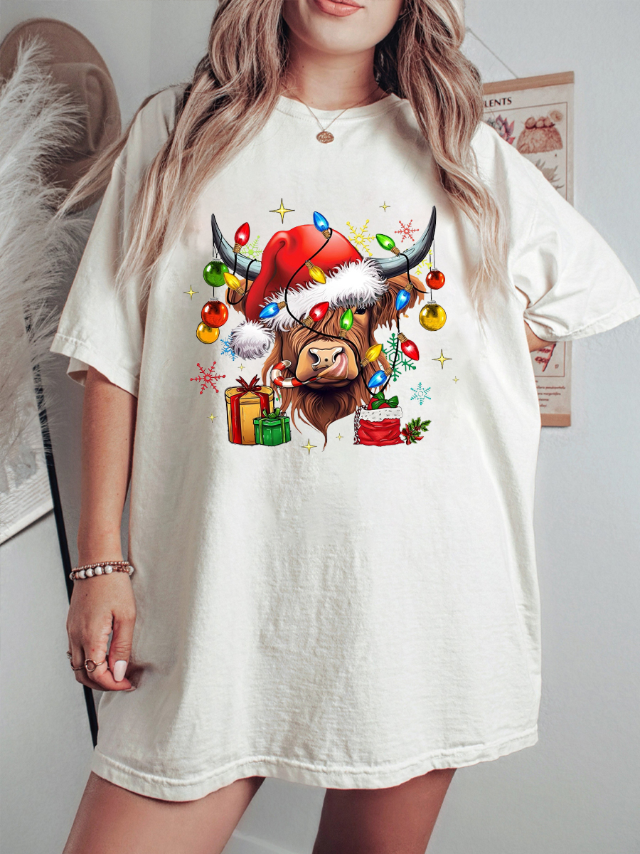 Plus Size Cow Christmas Lights Washed T-Shirt