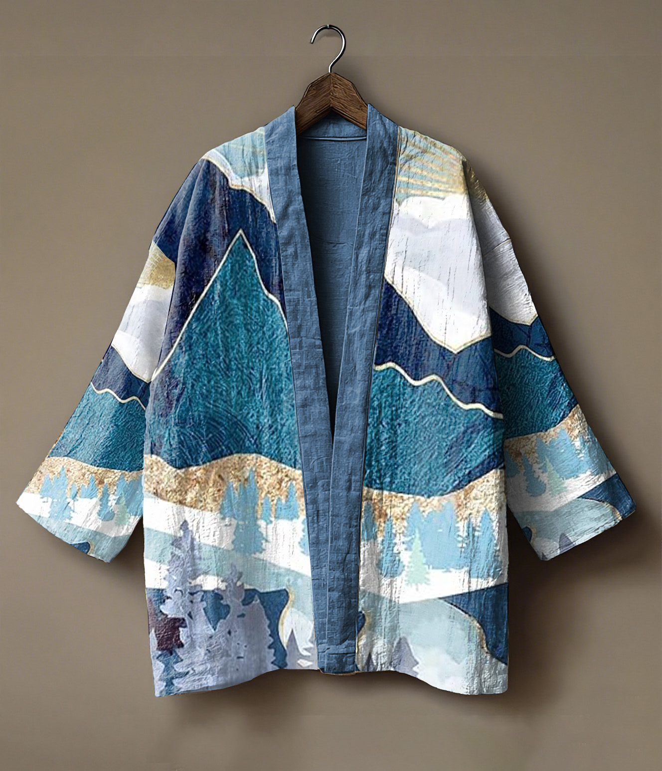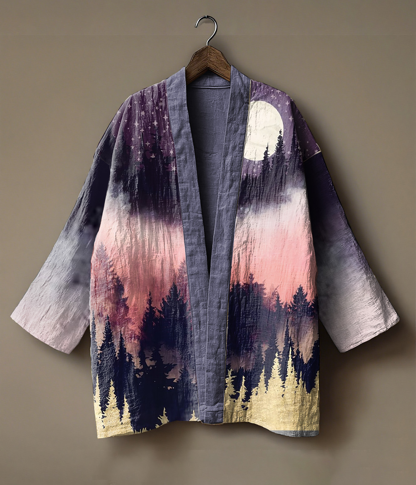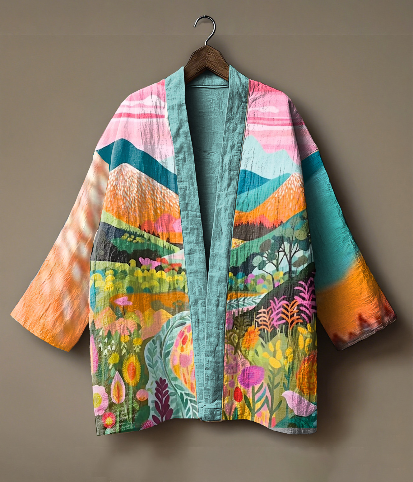 Sunrise-themed landscape printed linen andoupe cardigan