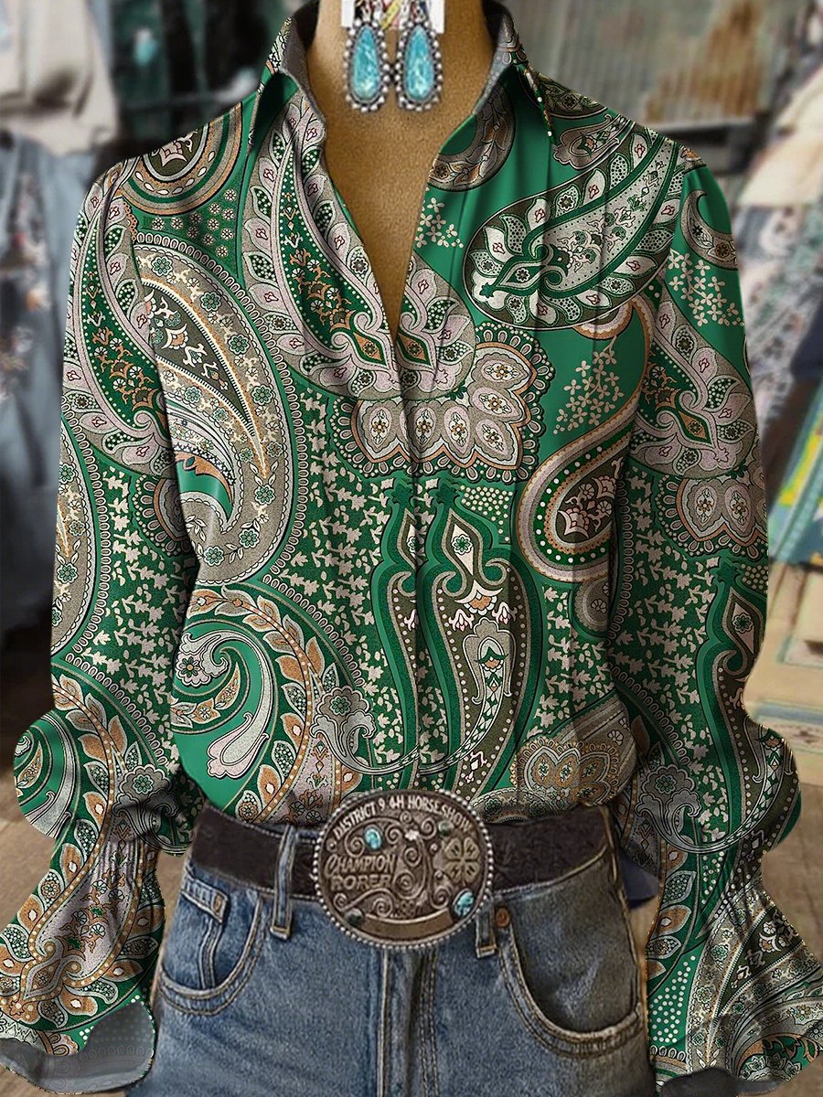 Women's Western Vintage Paisley Floral Print Western Bell Sleeve Shirt