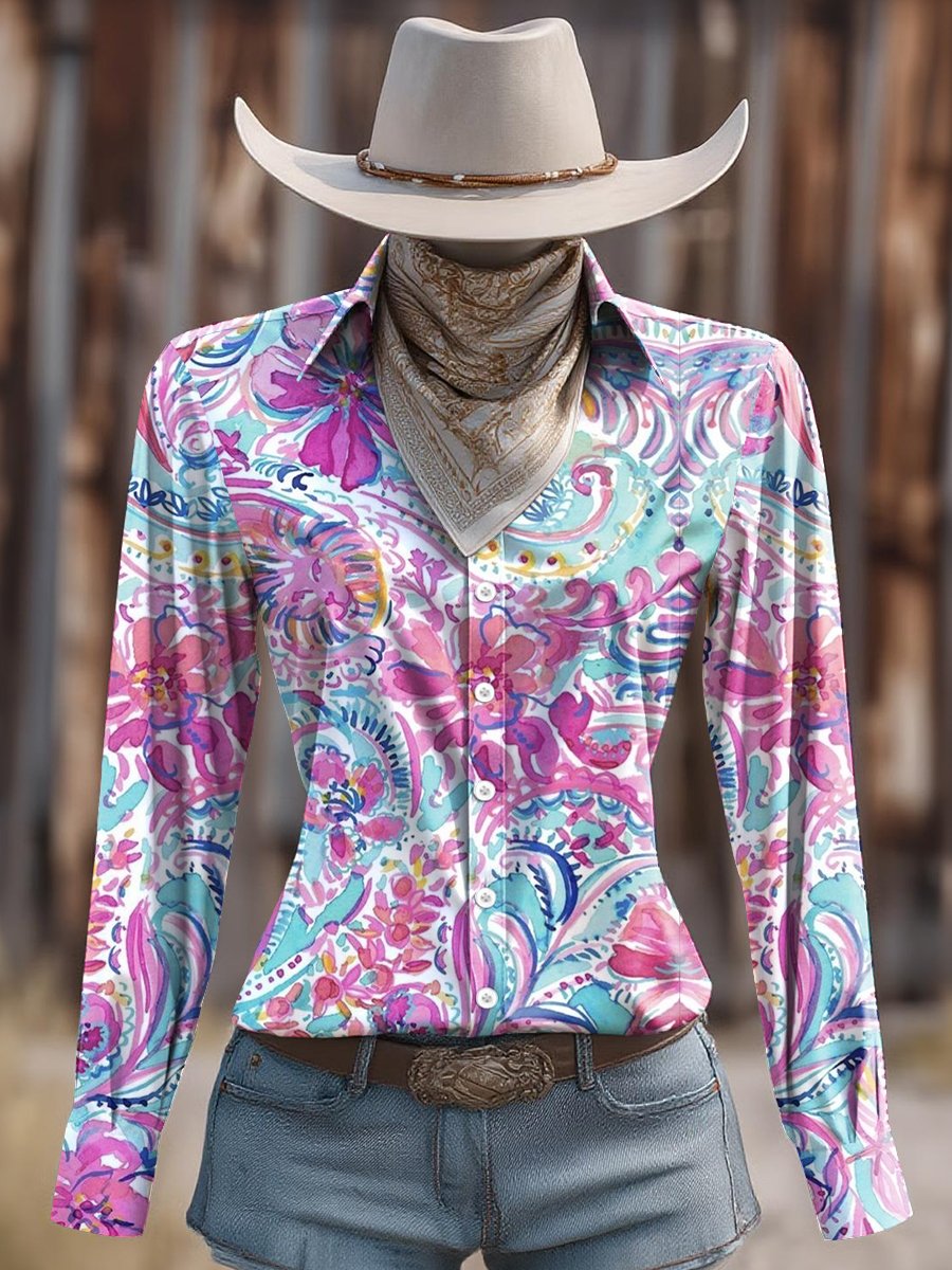 Women's Vintage Watercolor Floral Print Western Long Sleeve Shirt