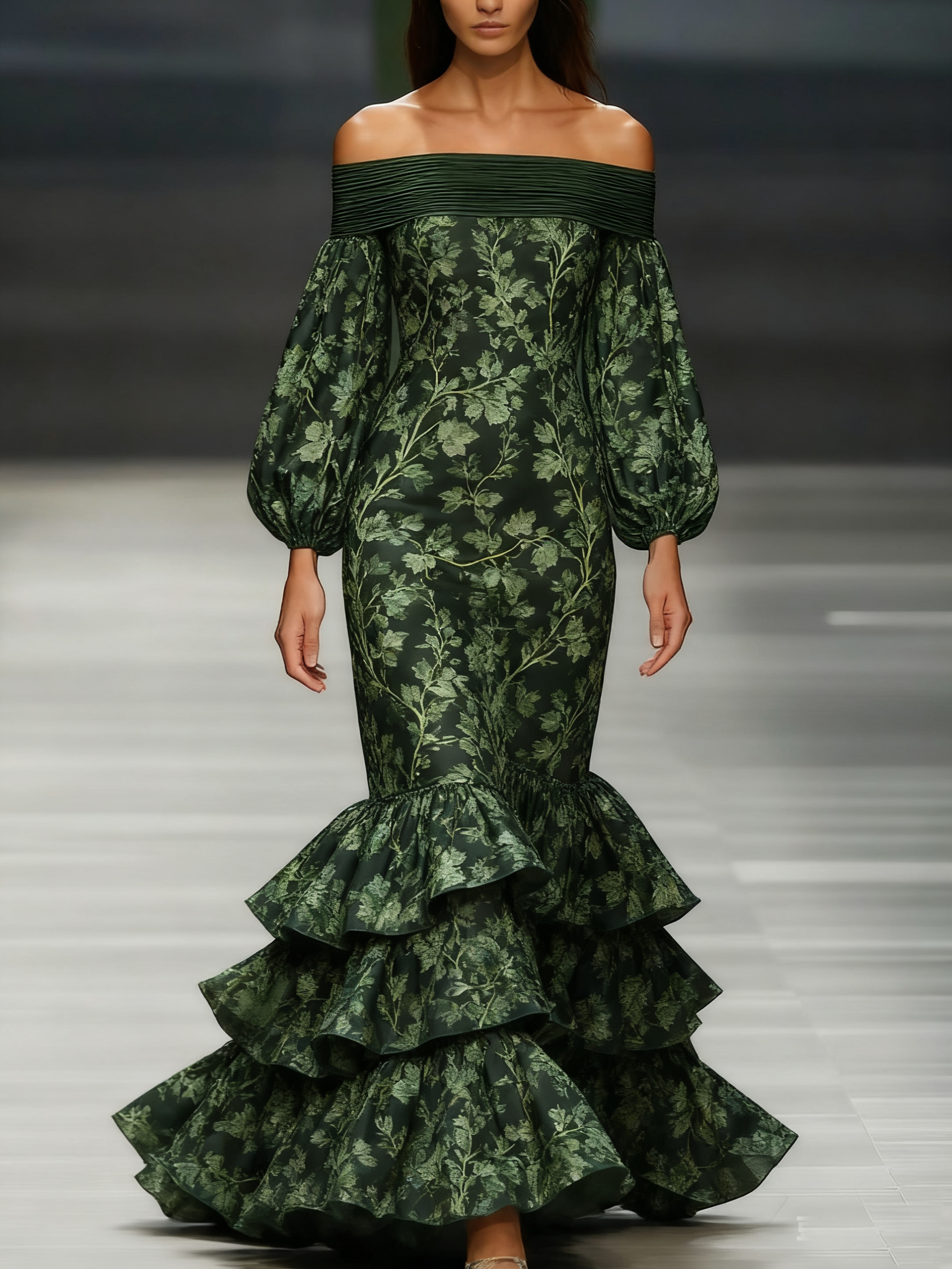 Women's off-the-shoulder long-sleeved green chiffon dress