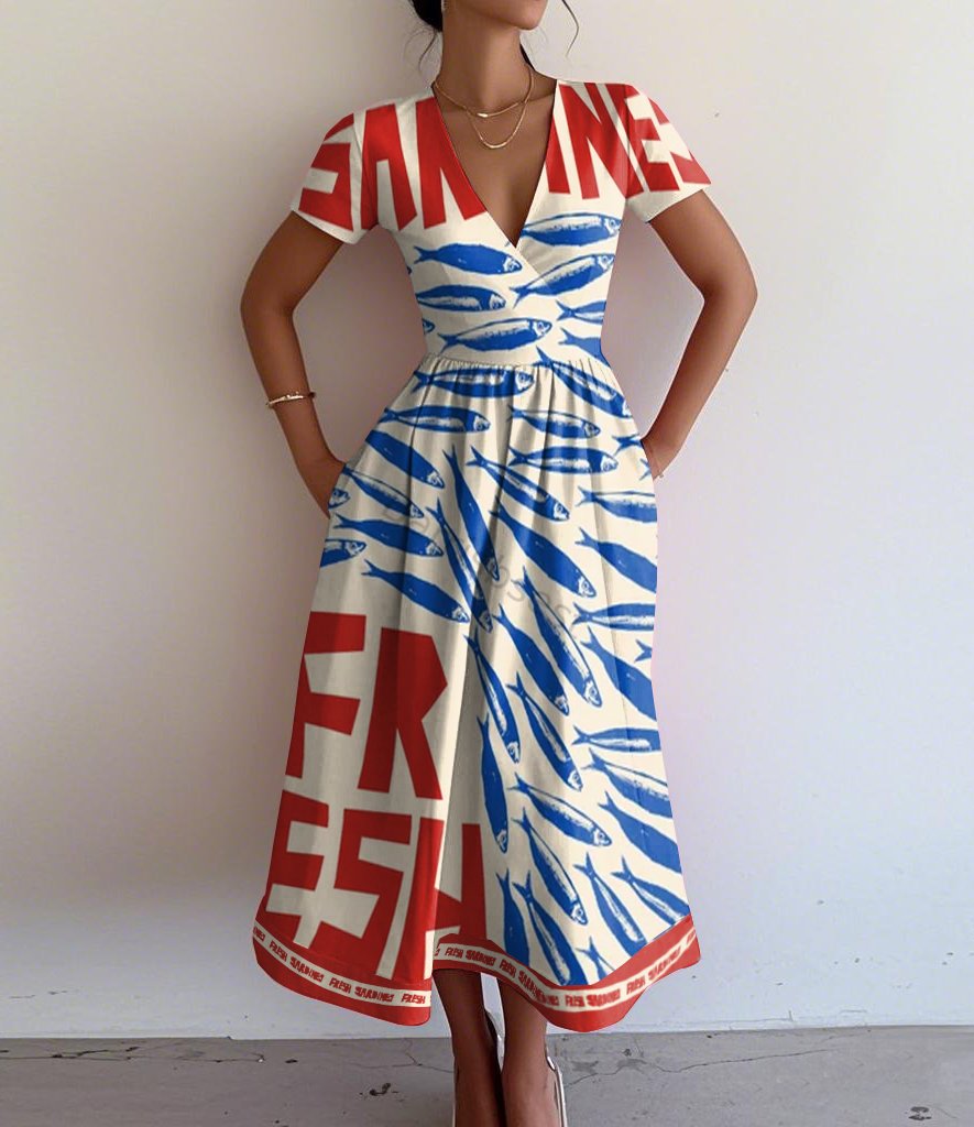 Retro Elegant Sardine Print V-Neck Short Sleeve Dress