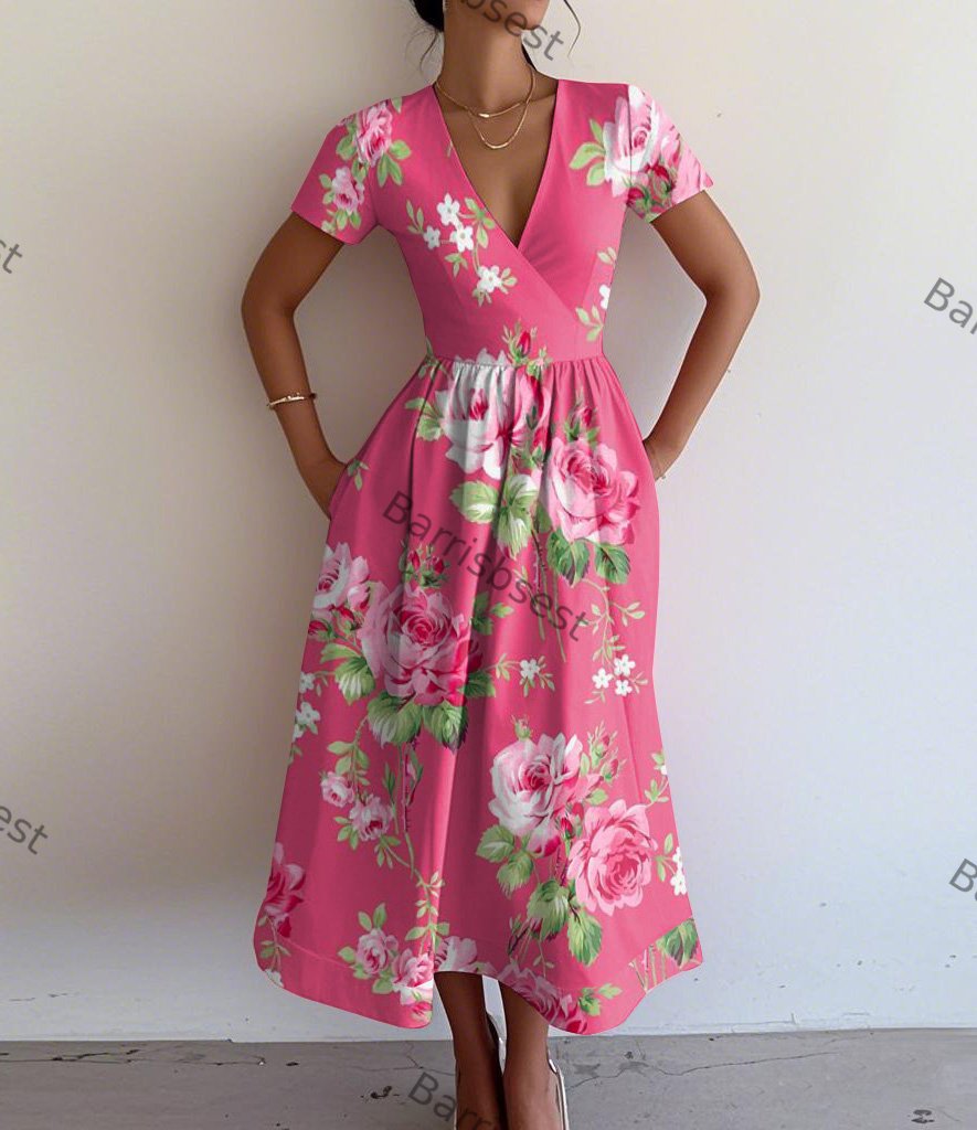 Retro Elegant Rose Print V-Neck Short Sleeve Dress