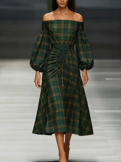 Women's off-the-shoulder long-sleeved green chiffon dress