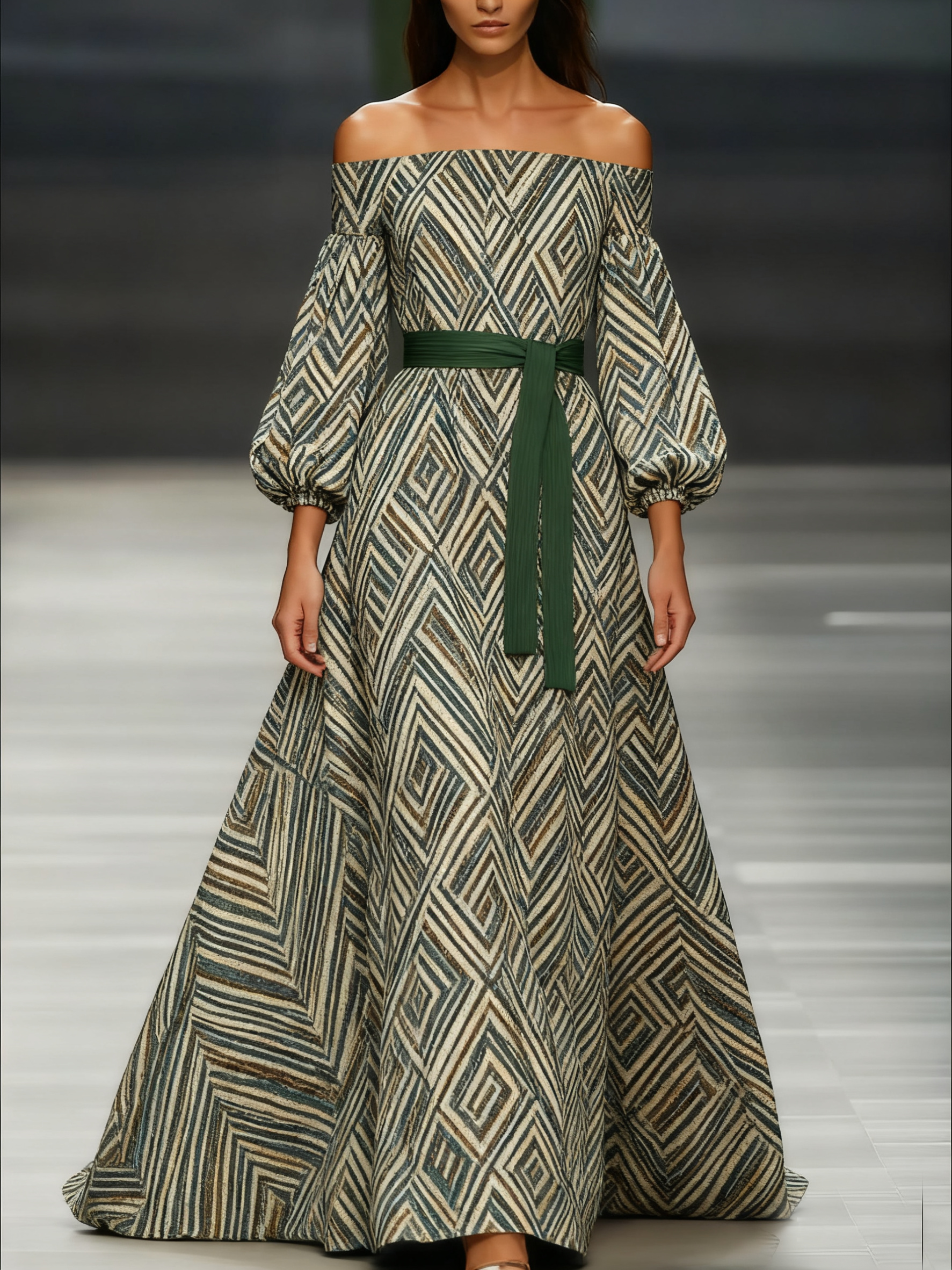 Women's off-the-shoulder long-sleeved green chiffon dress