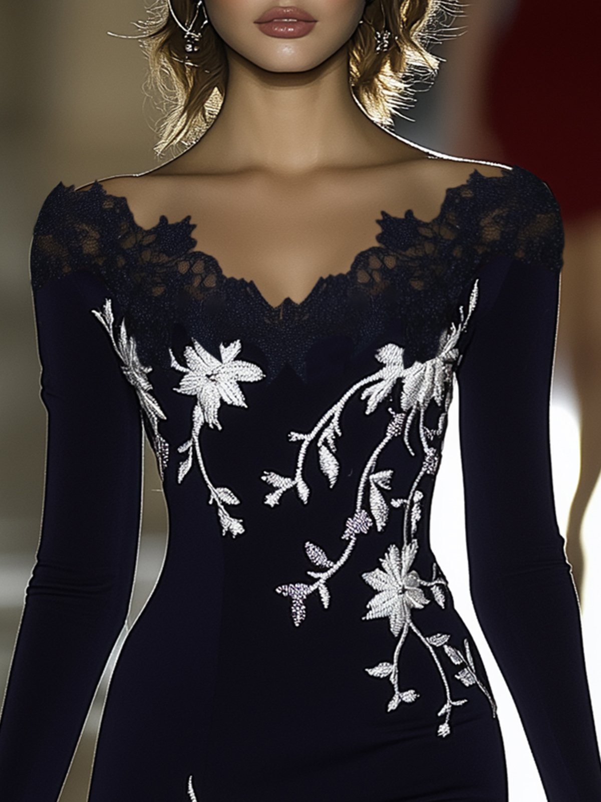 Shipping Black Lace V-Neck Bodycon Dress With Silver Floral Embroidery