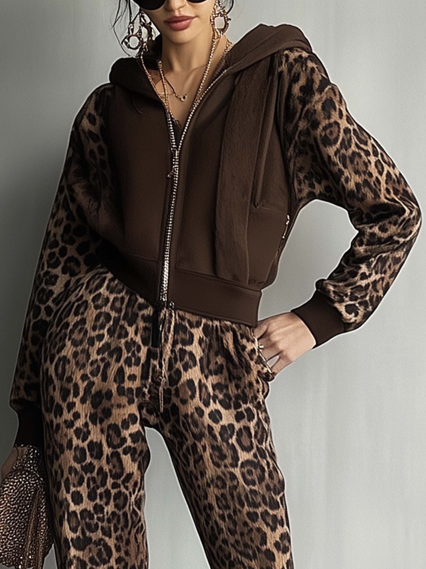 Brown Hooded Sweatshirt Jumpsuit With Leopard Print