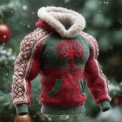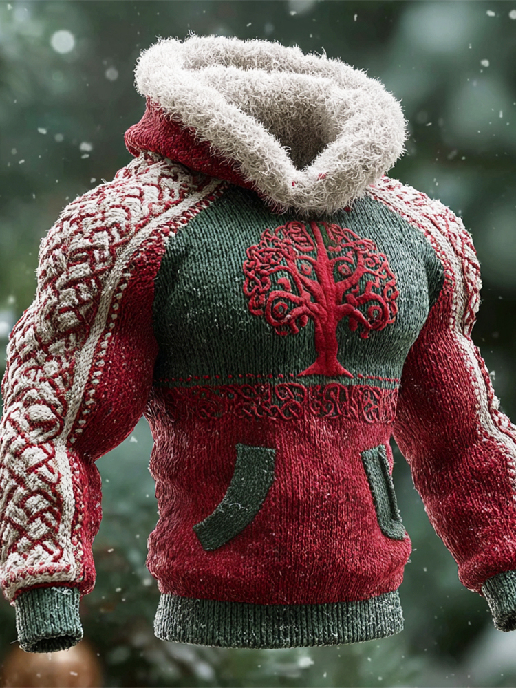 Christmas Viking Tree Men's Fur Trim Hooded Fleece Sweater