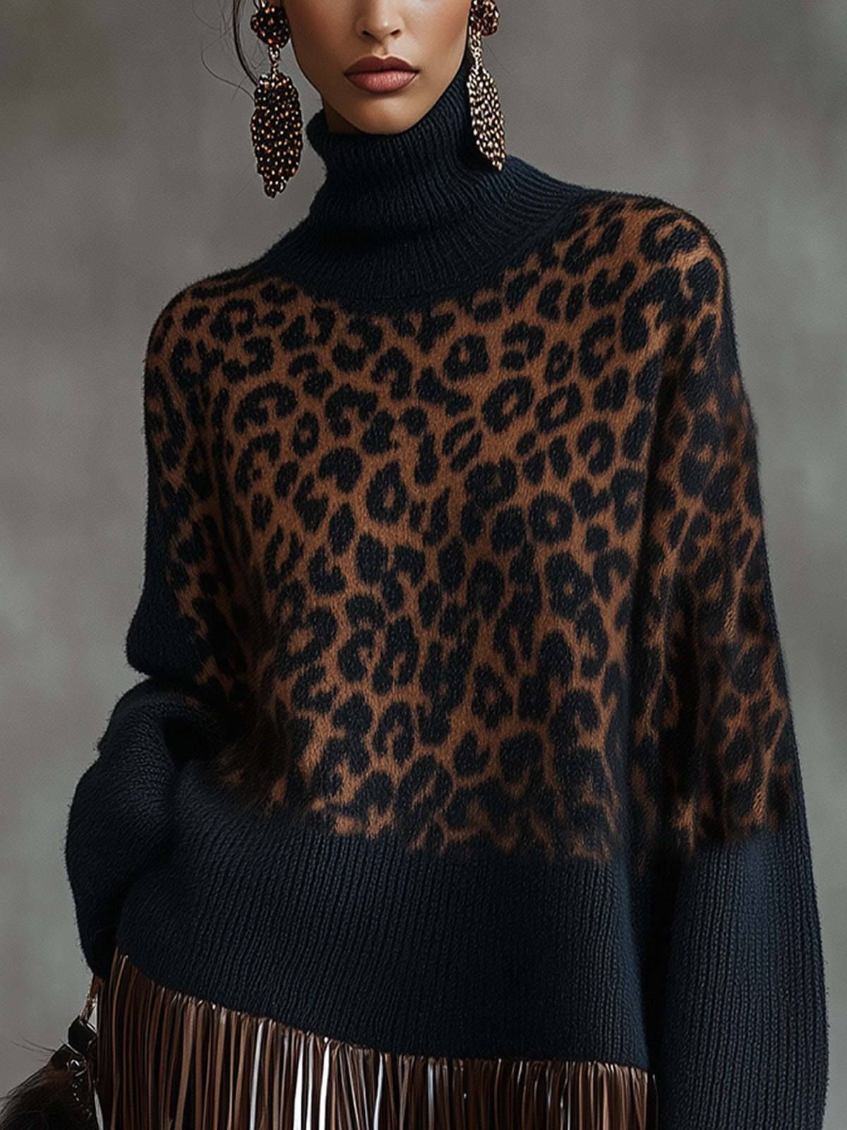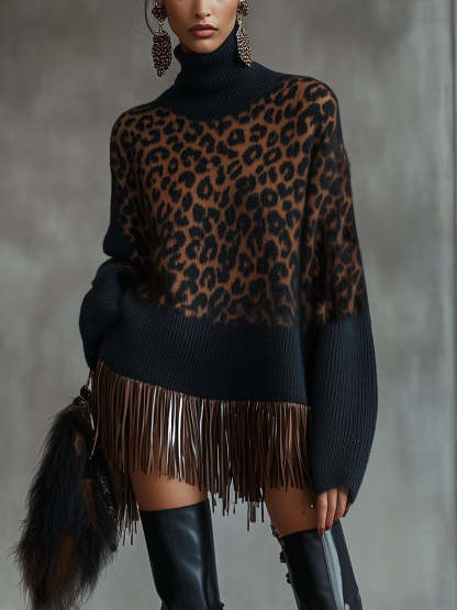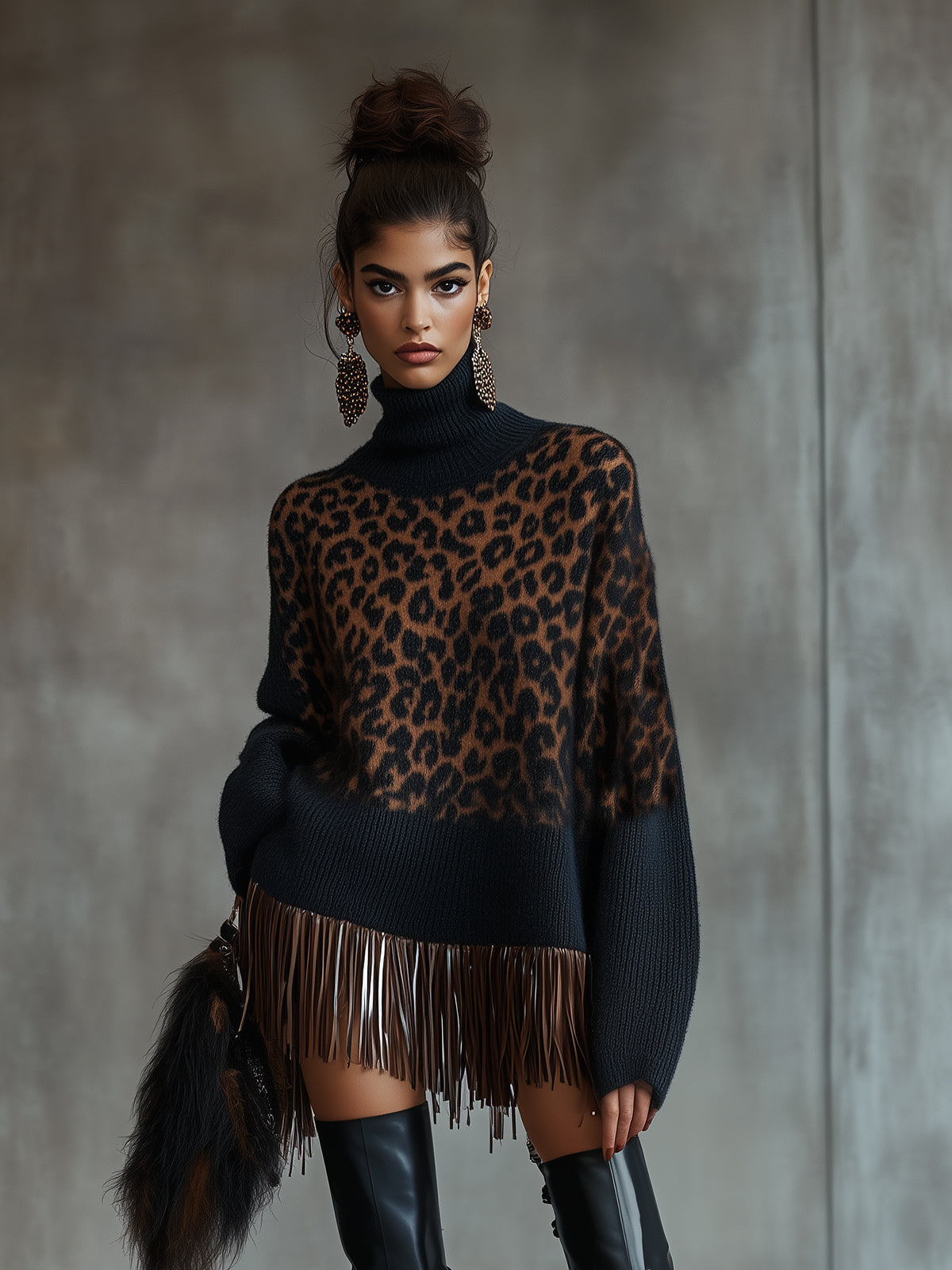 Dark Blue Fringe Leopard Turtleneck Knit Dress