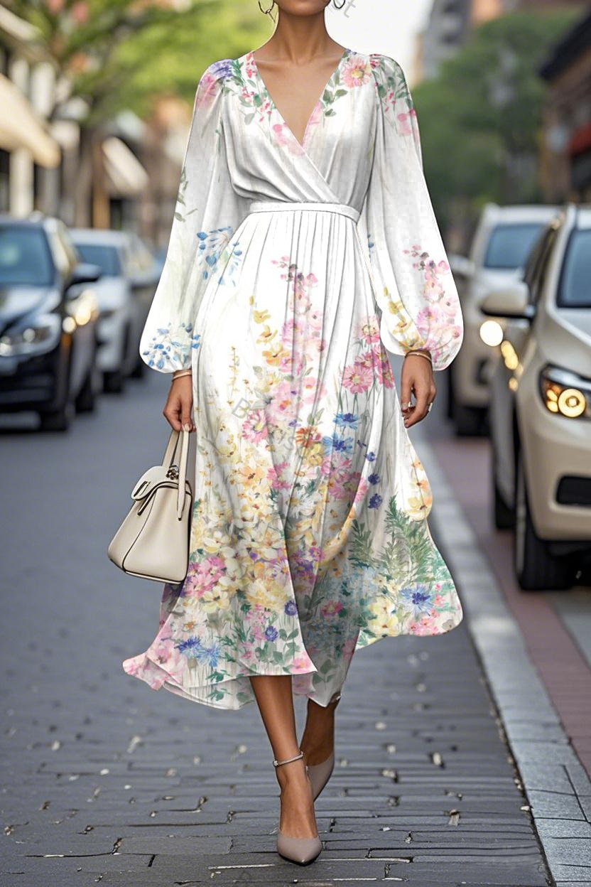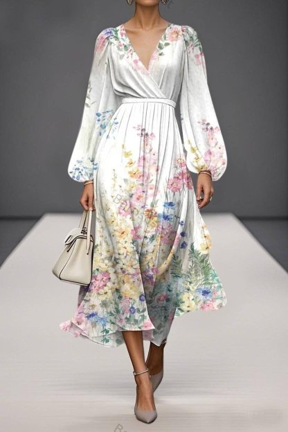 Elegant Floral Print Lantern Sleeves V-neck A-line Midi Chiffon Dress