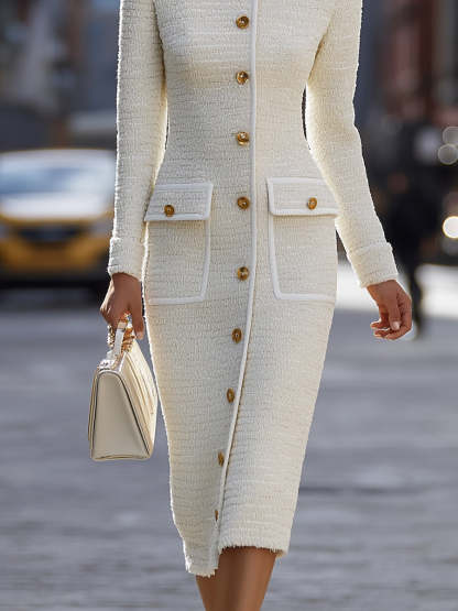 Ivory Tweed Button-Down Midi Dress With Patch Pockets