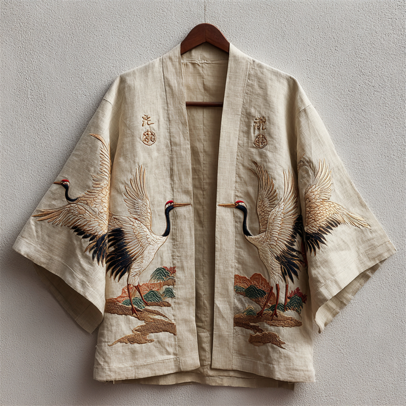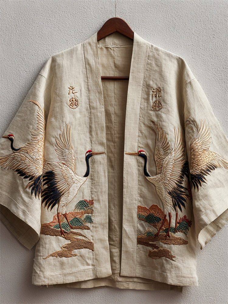 Japanese Cranes Landscape Embroidered Linen Kimono Cardigan