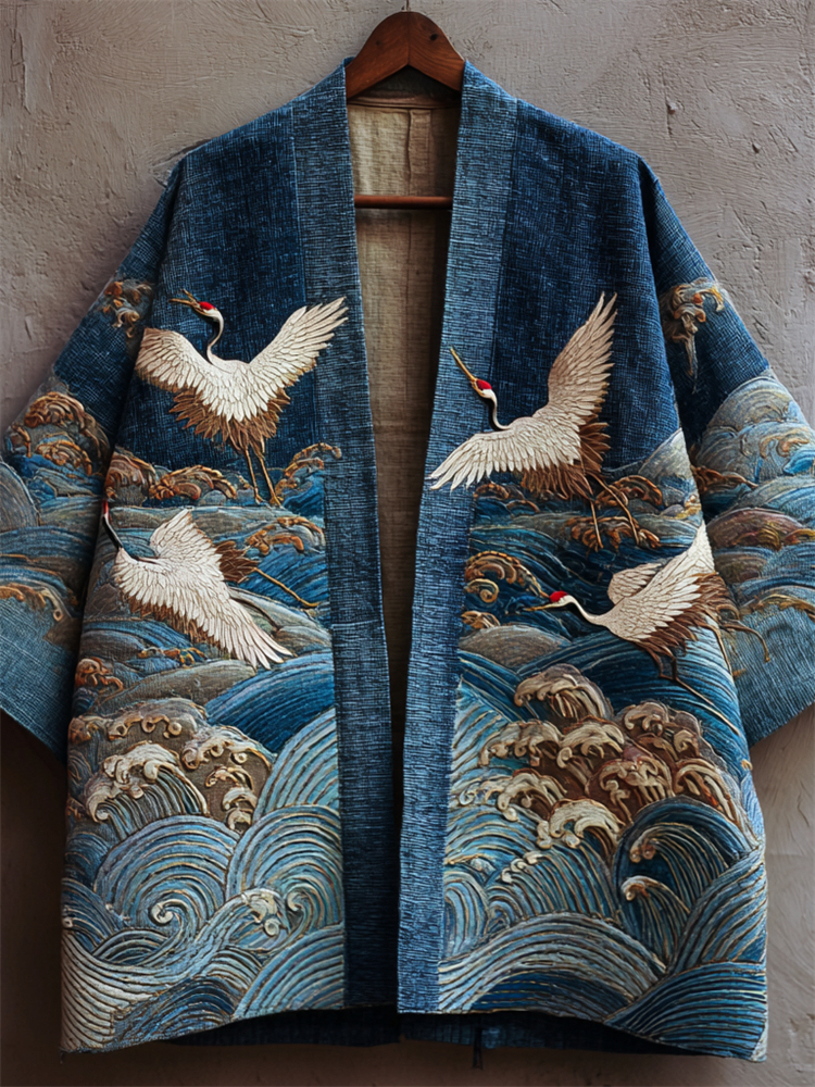 Japanese Cranes & Sea Waves Embroidered Linen Kimono Cardigan