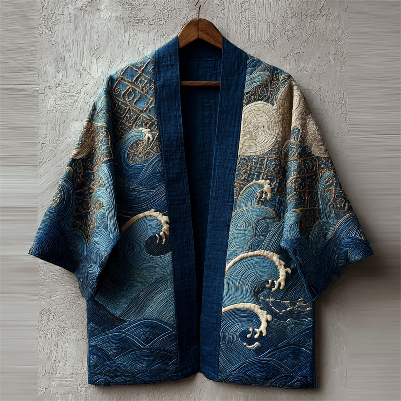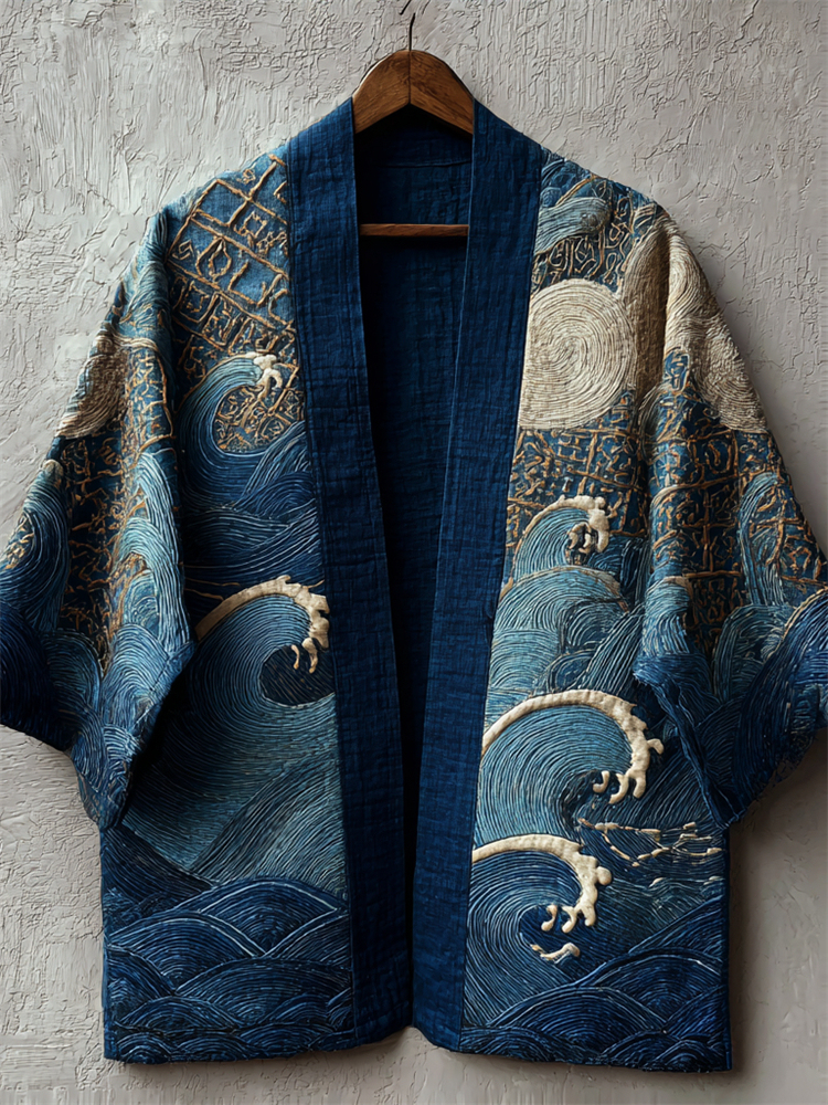 Japanese Sea Waves Sashiko Art Embroidered Linen Kimono Cardigan