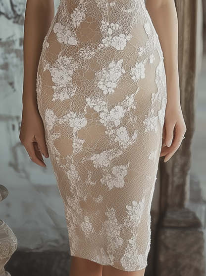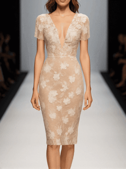Shipping Light Beige Lace V-neck Short Sleeve Bodycon Dress