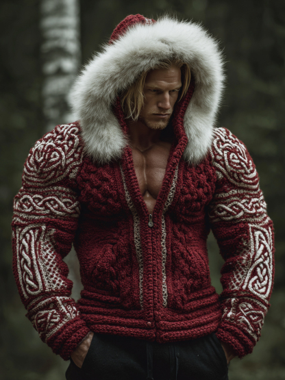 Men's Vintage Viking Celtic Knot Jacquard Hooded Knit Sweater Jacket