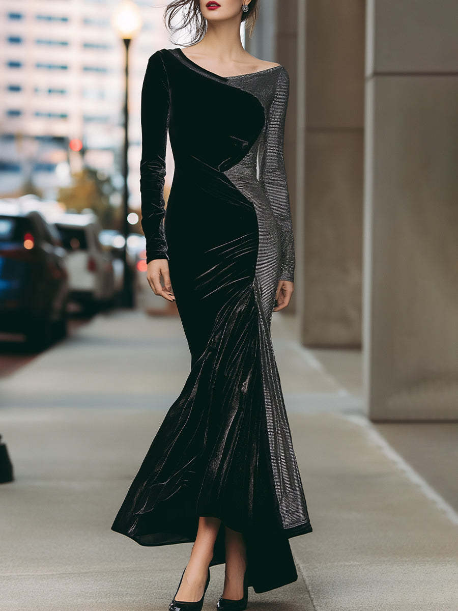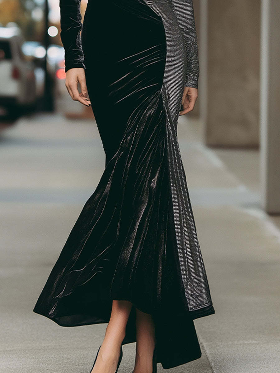 redefines evening elegance with the Monochrome Velvet Panel Gown, an architectural creation that balances drama with sophistication. This floor-sweeping gown combines jet-black velvet with metallic silver velvet in an asymmetric panel construction, creating a striking interplay of texture and contrast. The fluid lines of the panels contour the body, drawing the eye along the silhouette and emphasizing sculptural precision.