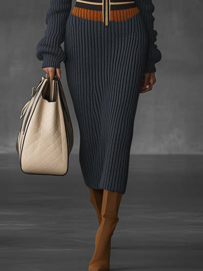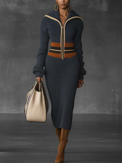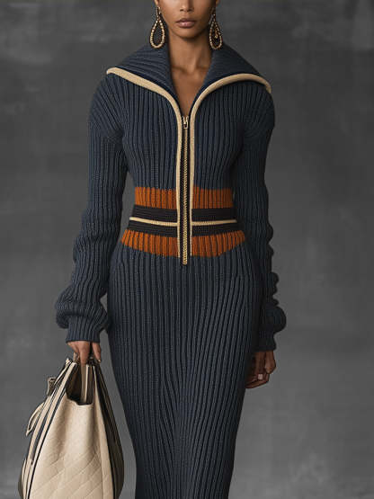 Navy Blue Chic Ribbed Knit Zipper Dress