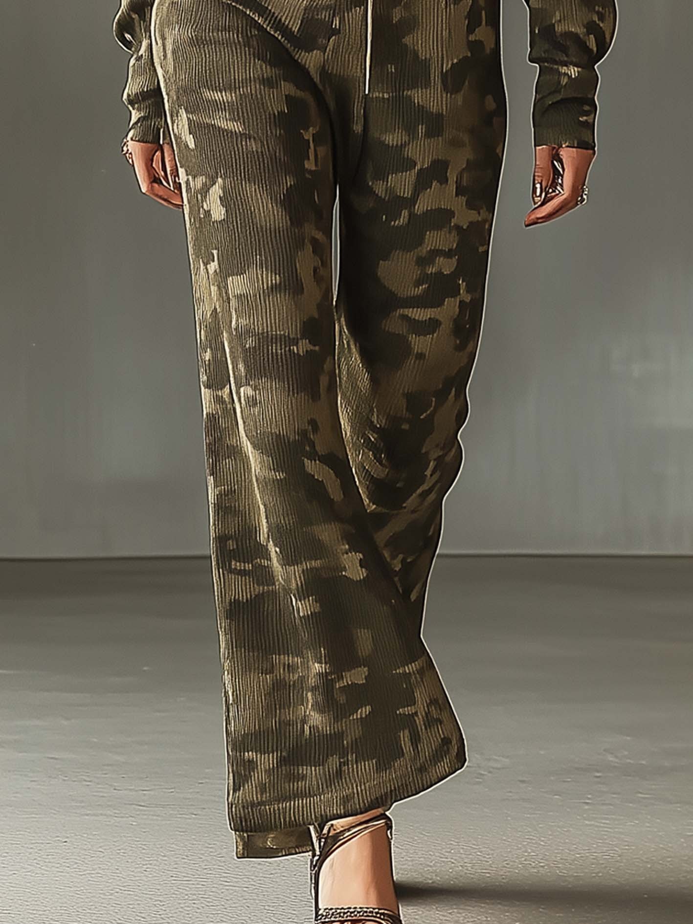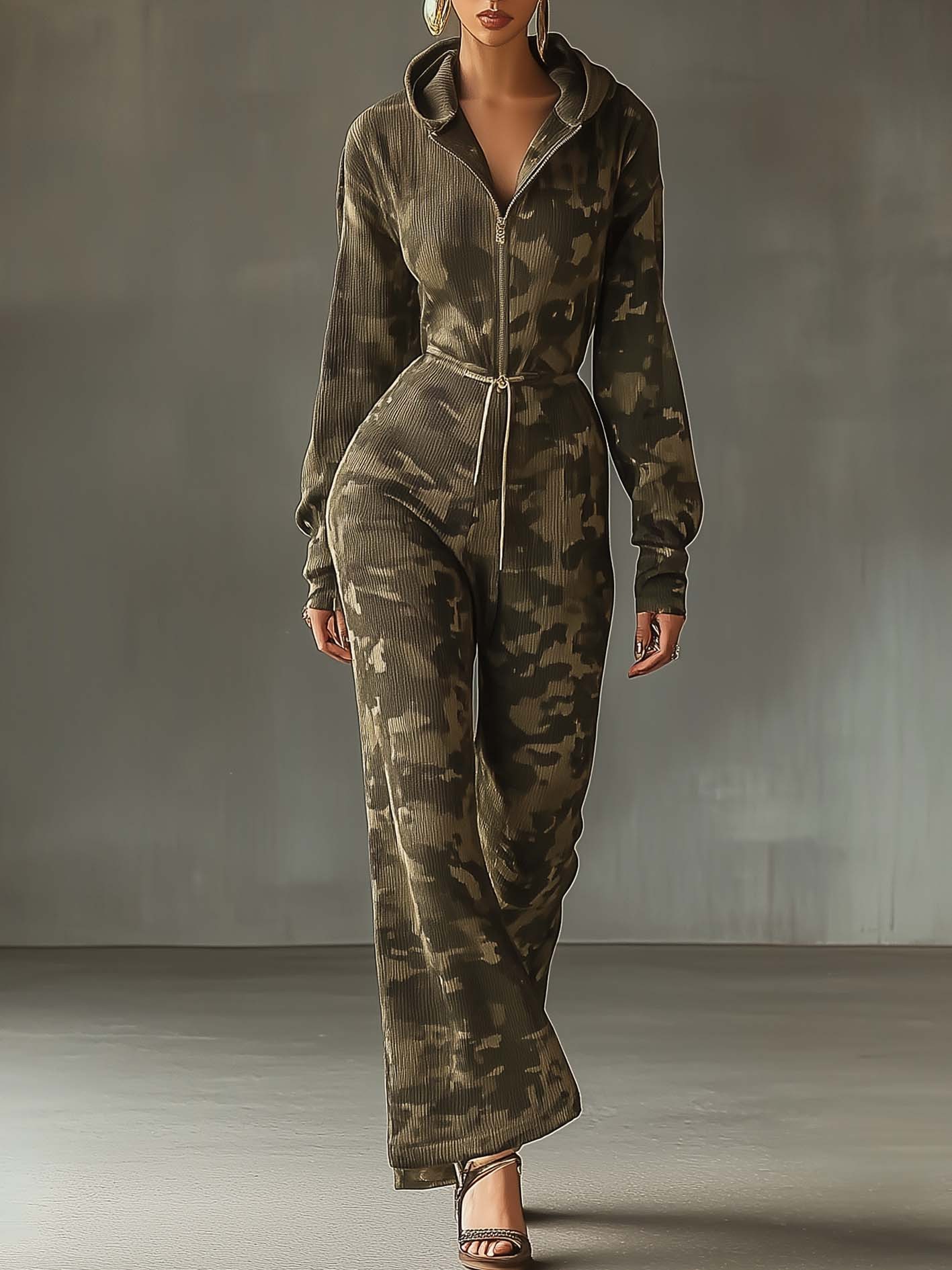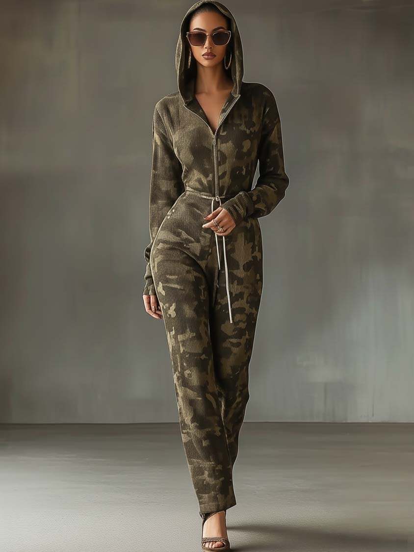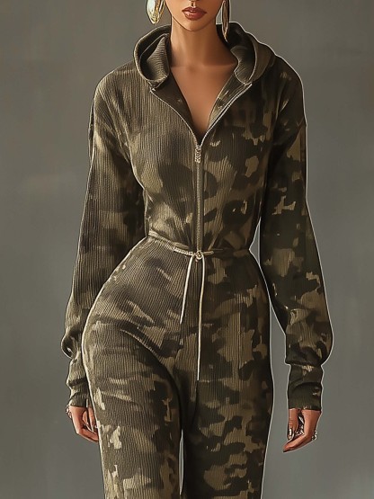 Olive Green Hooded Sweatshirt Jumpsuit With Camouflage