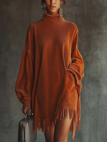 Orange corduroy loose tassel hem high collar dress