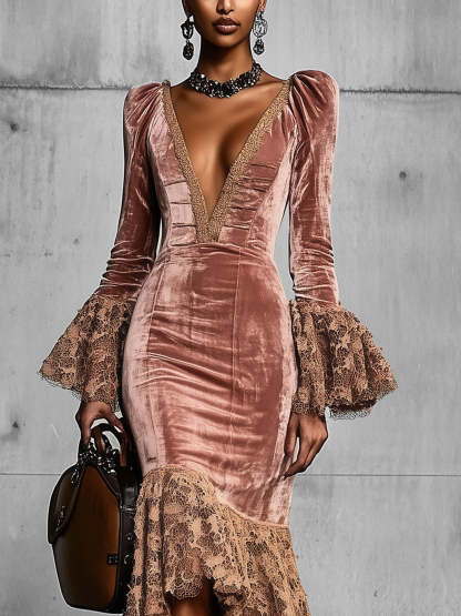 Pink Velvet And Lace Midi Dress