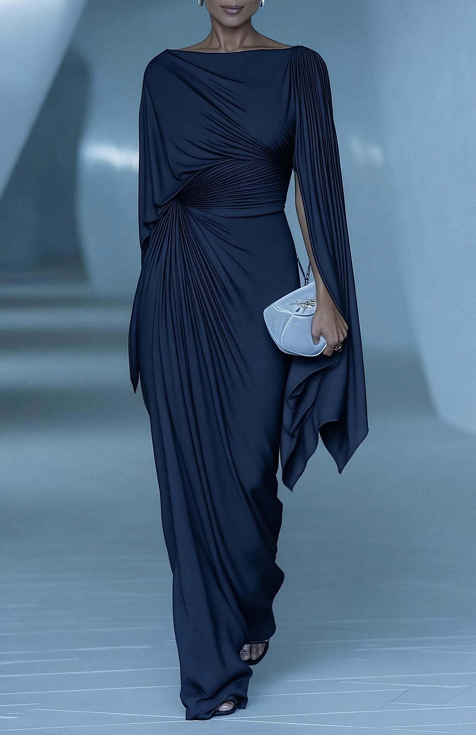 Pleated irregular drape slim-fit maxi dress