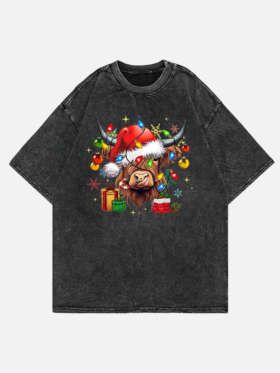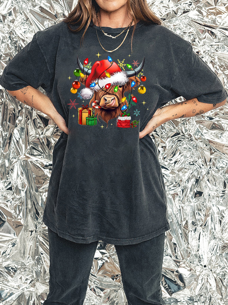 Plus Size Cow Christmas Lights Washed T-Shirt