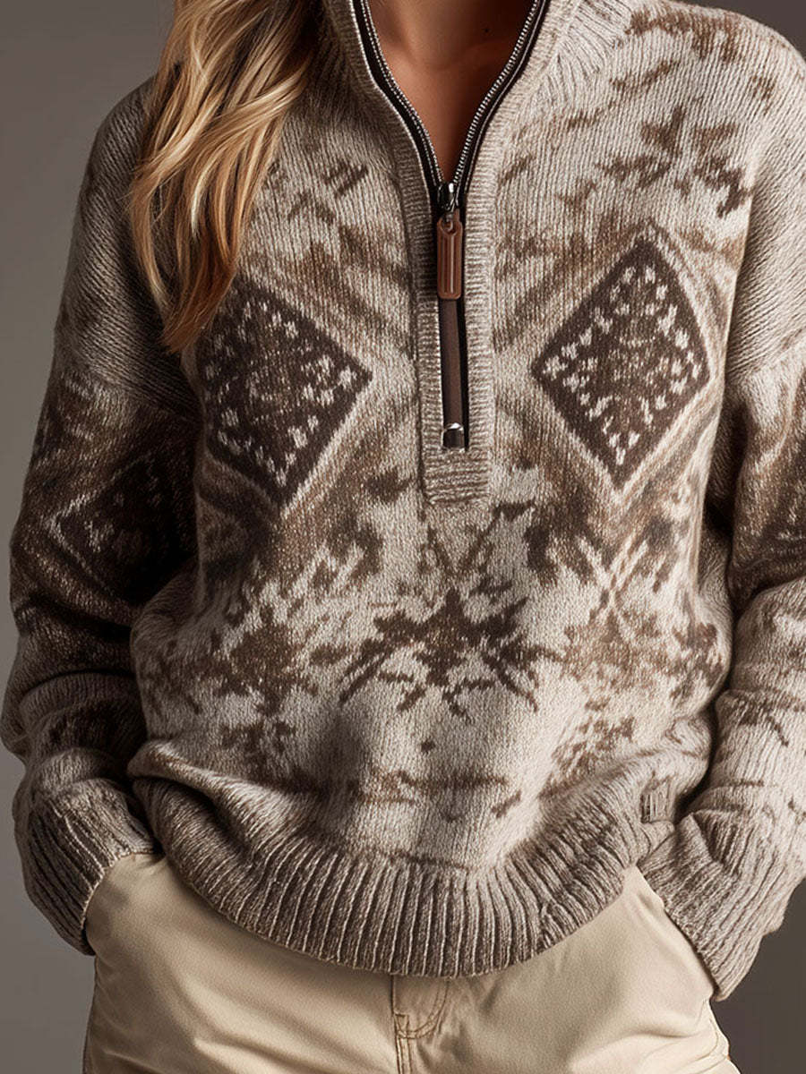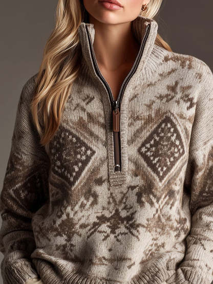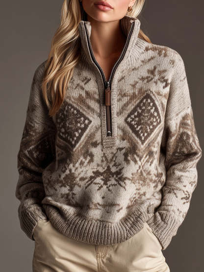 Retro Beige Geometric Pattern Beige Half-Zip Knit Pullover