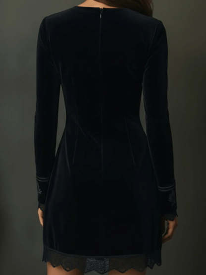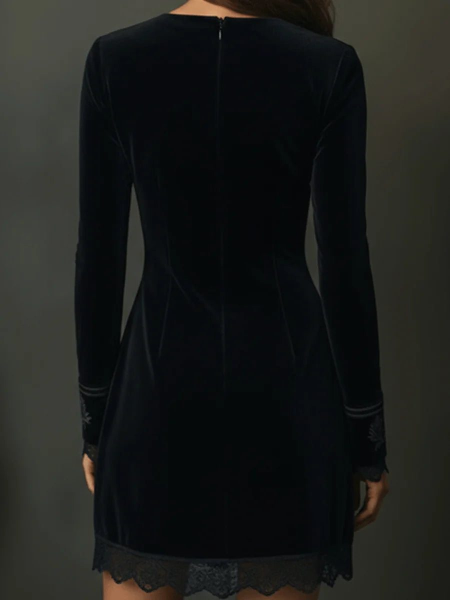 Retro Black Velvet Embroidered Lace Trim Mini Dress