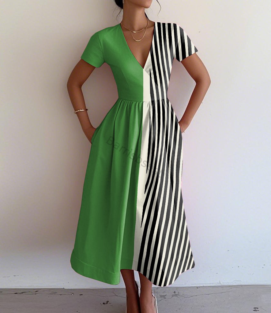 Retro Elegant Abstract Geometric Print V-Neck Short Sleeve Dress