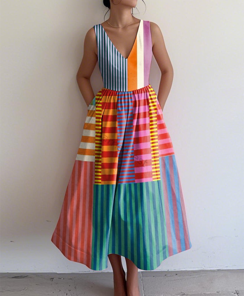 Retro Elegant Abstract Print V Neck Sleeveless Dress