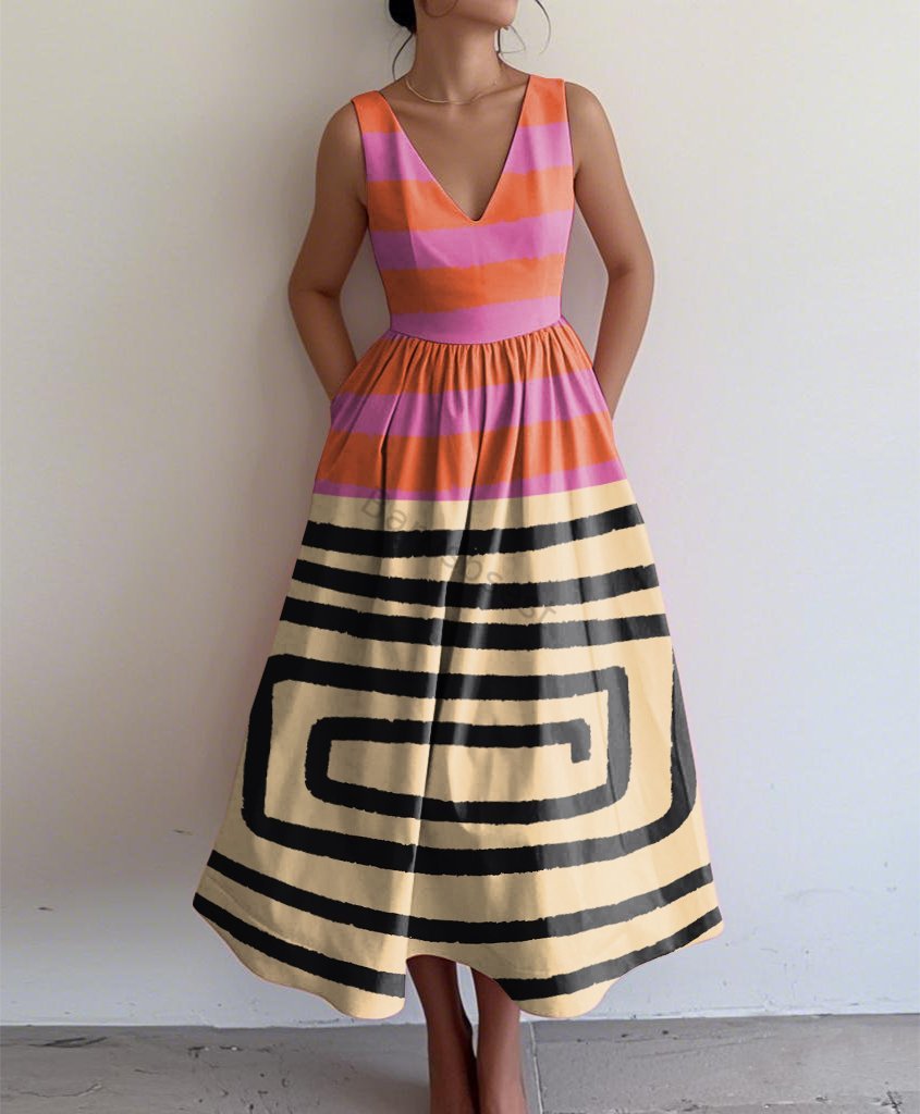 Retro Elegant Abstract Print V Neck Sleeveless Dress