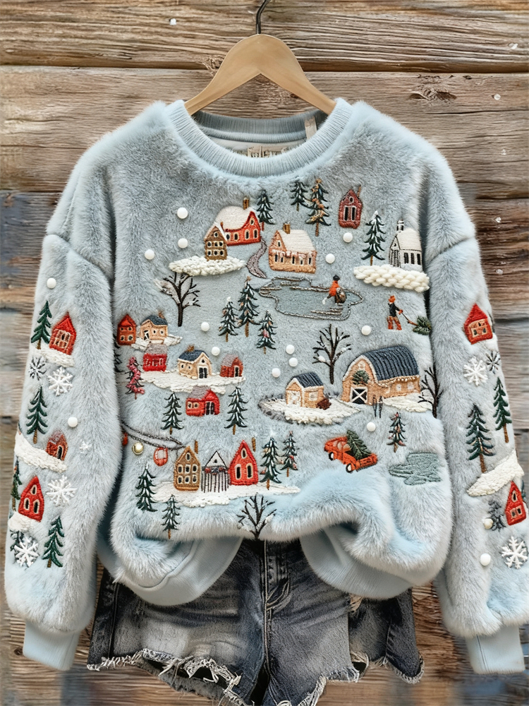 Snowy Ski Resorts Landscape Embroidered Cozy Plush Sweatshirt