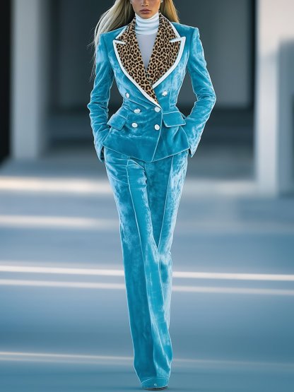 Shipping Stylish Blue Velvet Suit With Leopard Print Lapel