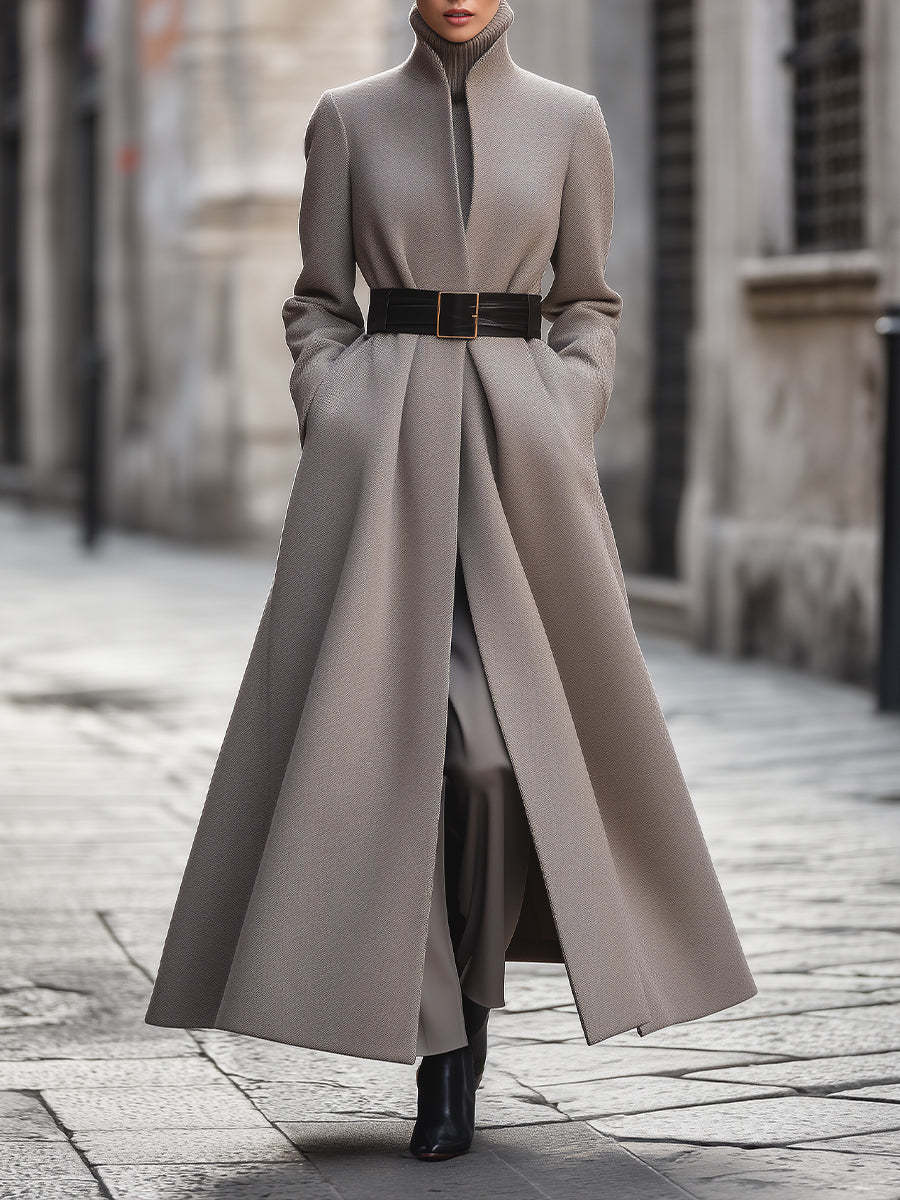 The design is elevated by a wide black waist belt with a gold buckle, creating striking contrast while cinching the waist for a flattering, defined shape. The sweeping full-length hem enhances the coat’s dramatic profile, making it as commanding as it is elegant. Practical side pockets add functionality without interrupting the streamlined lines.