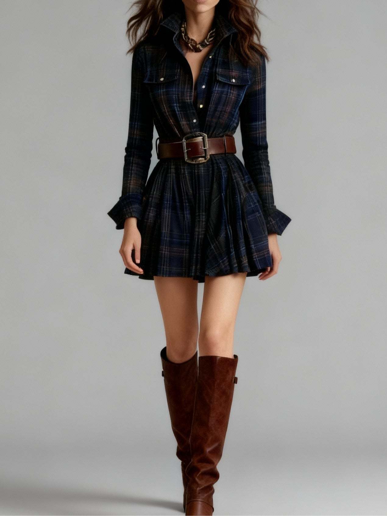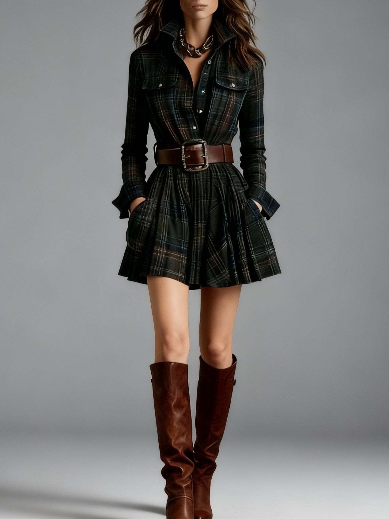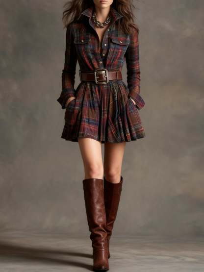 Vintage Lapel Red and Brown Plaid Mini Dress(Includes belt)