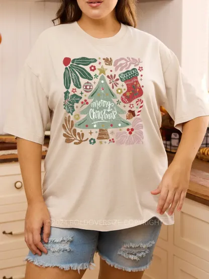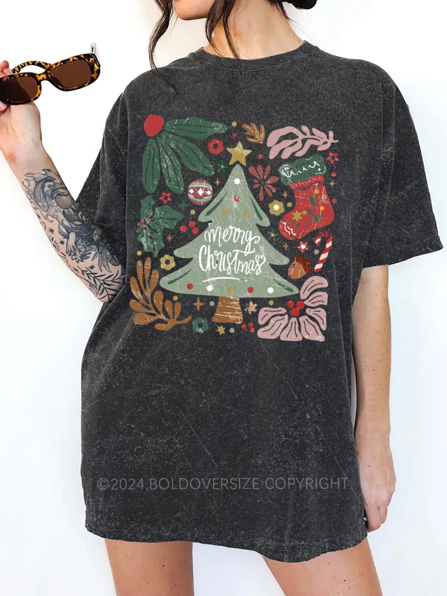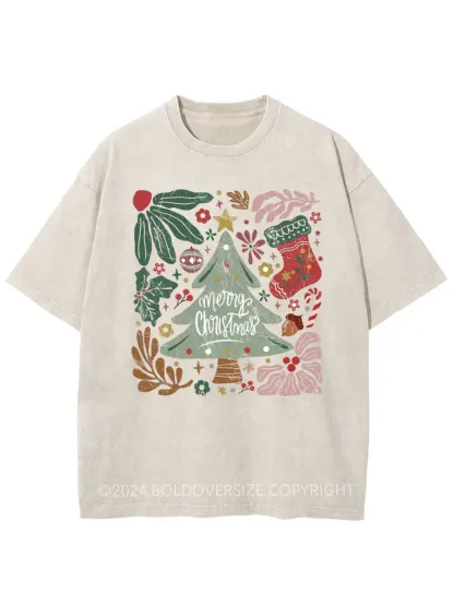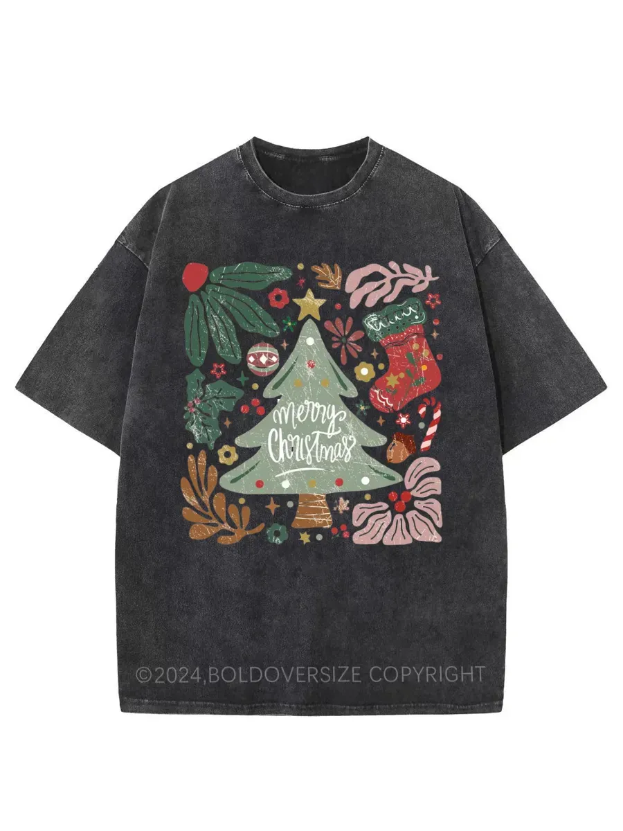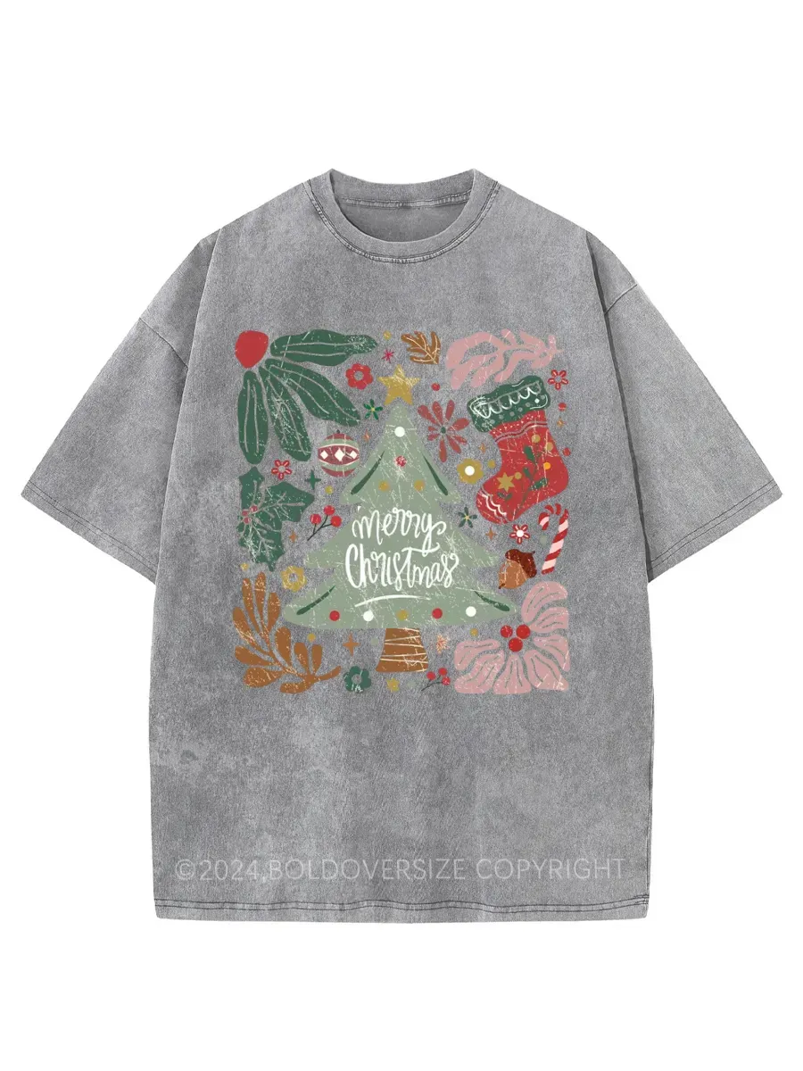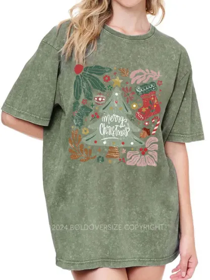 Vintage Merry Christmas Green Flora Washed T-Shirt