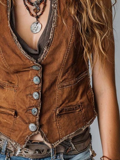 Combining vintage aesthetics with contemporary flair, the Washed Caramel Denim Vest with Brass Button Stitching is an essential addition to any wardrobe. Whether worn casually or dressed up, its versatile style ensures you’re always in fashion.