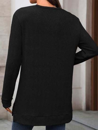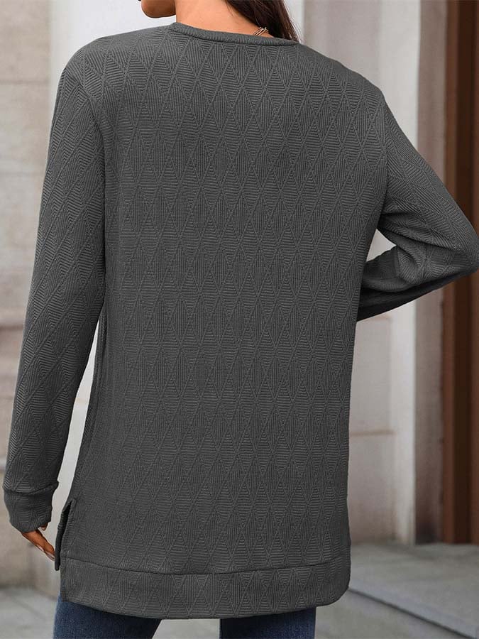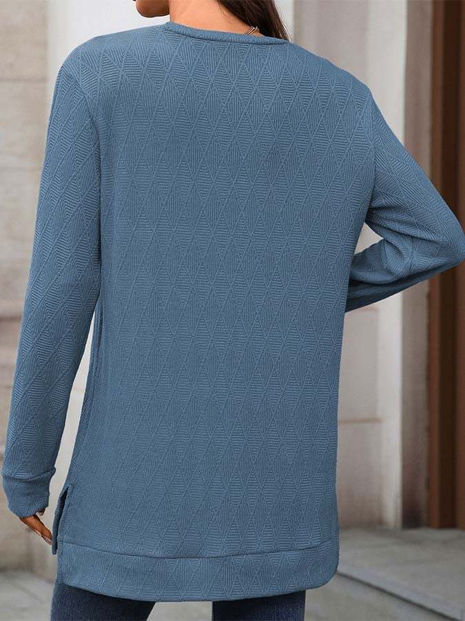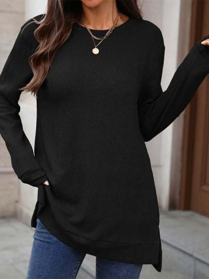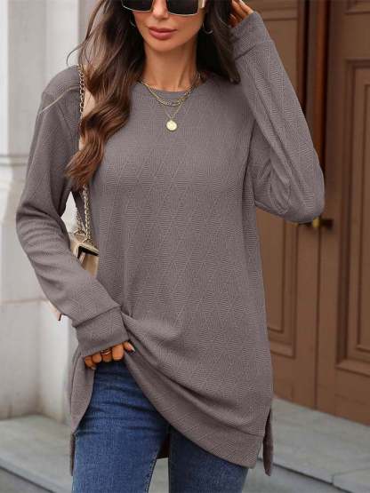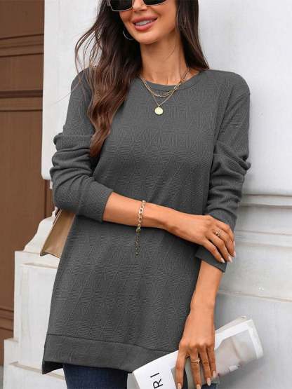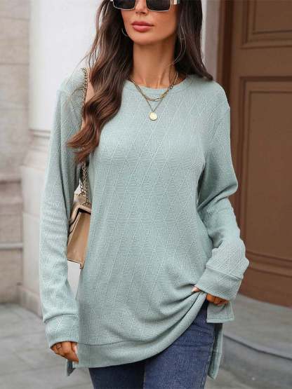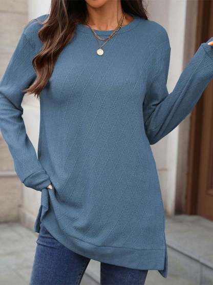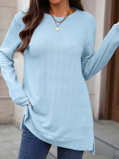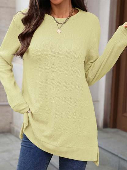 Women'S Casual Solid Color Round Neck Long Sleeve Knitted Jacquard Top T-Shirt