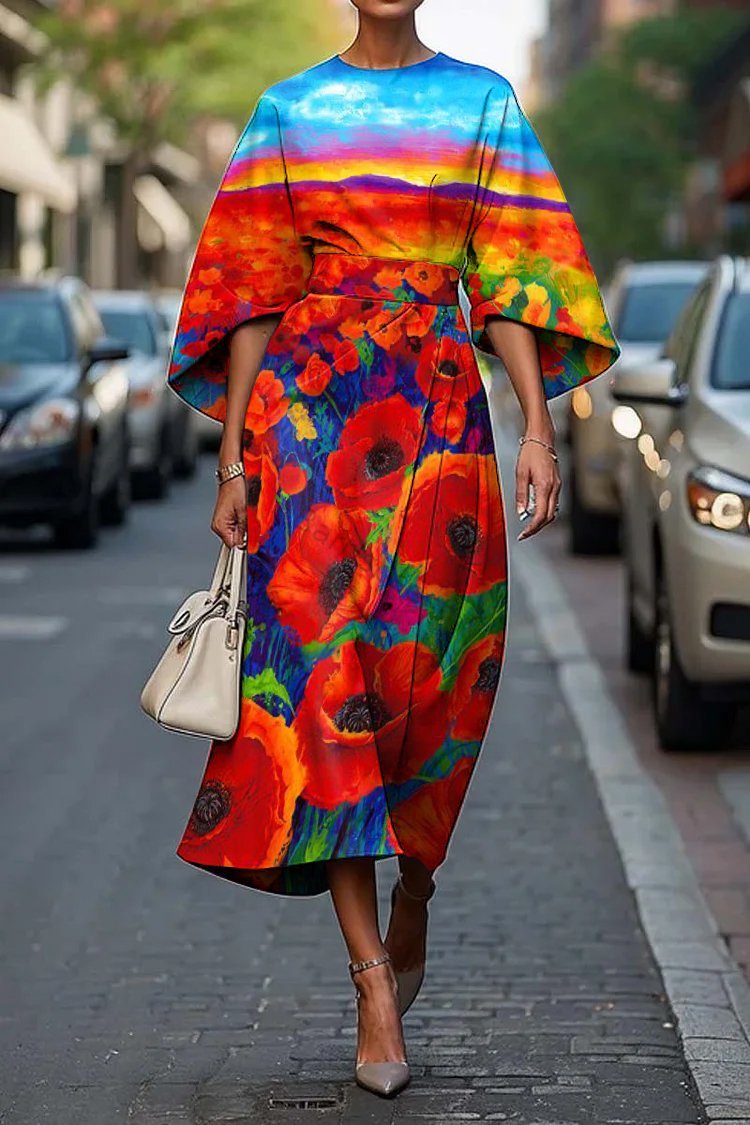 Women's Elegant Poppy Art Print Midi Dress