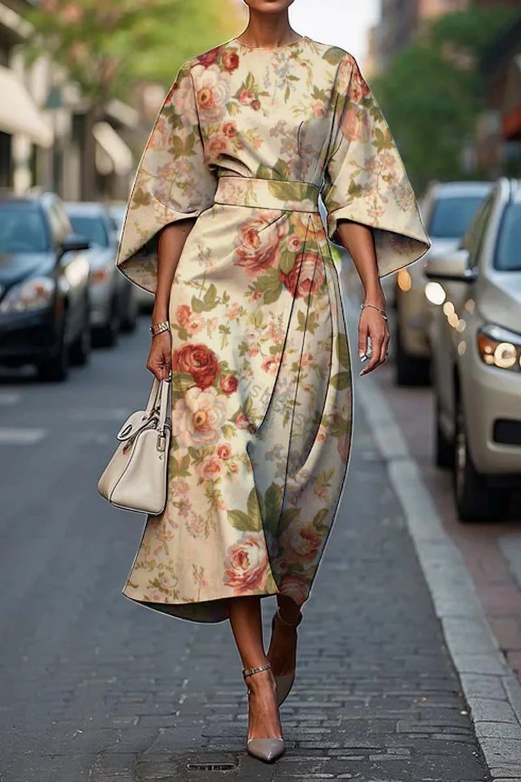 Women's Elegant Vintage Floral Print Midi Dress