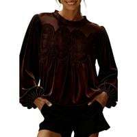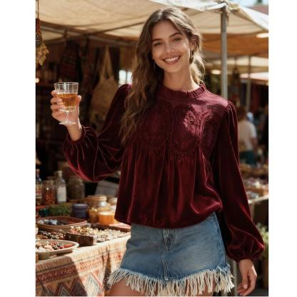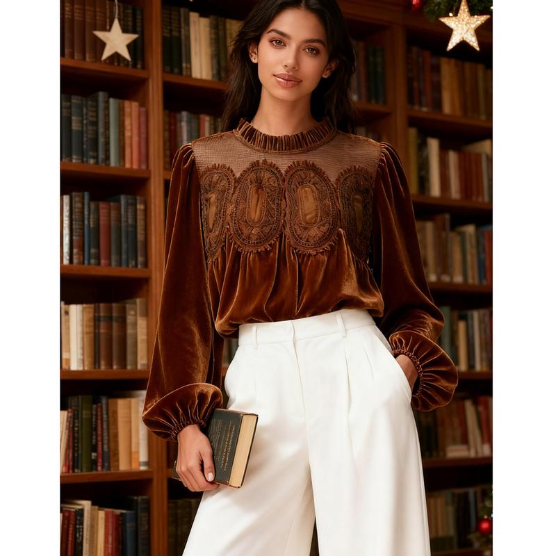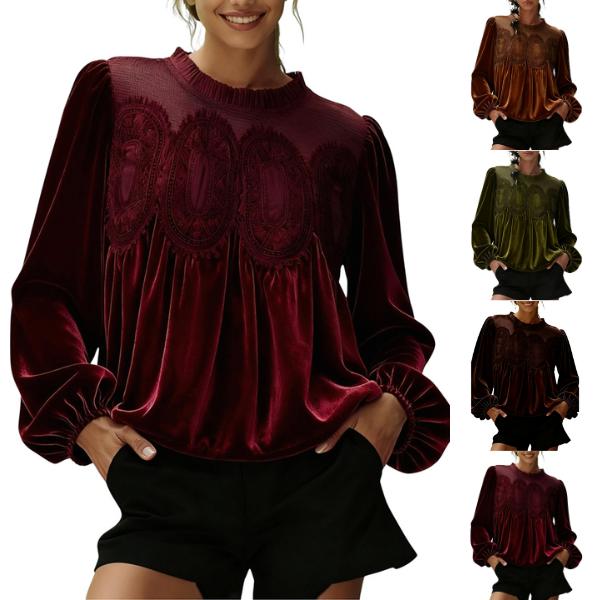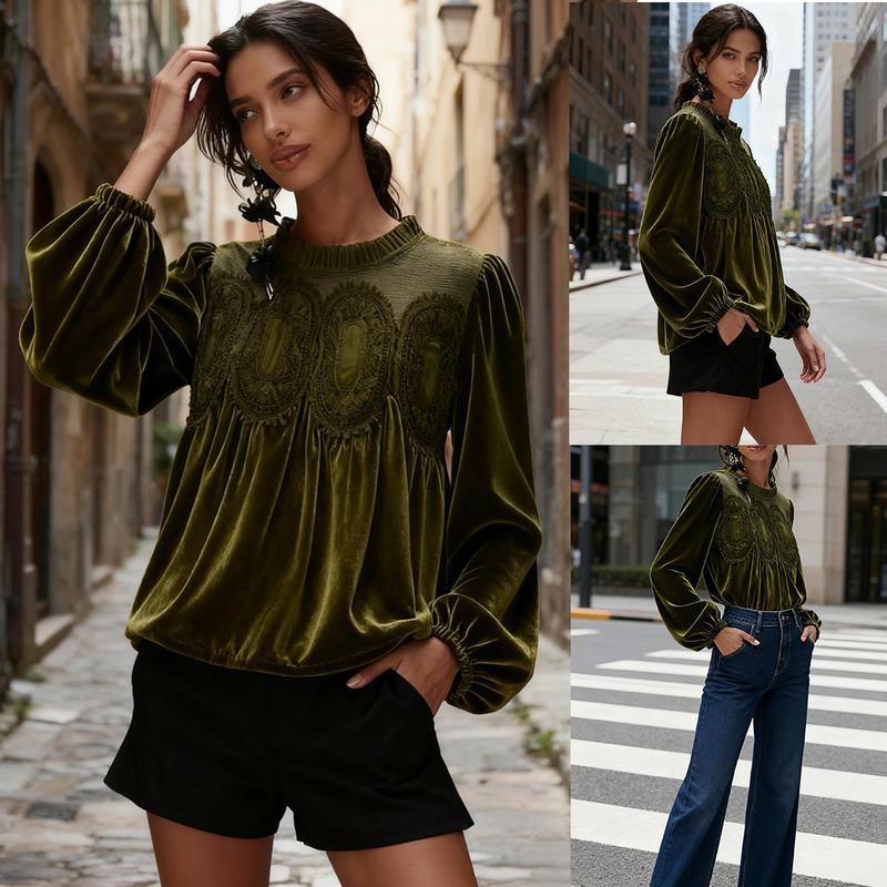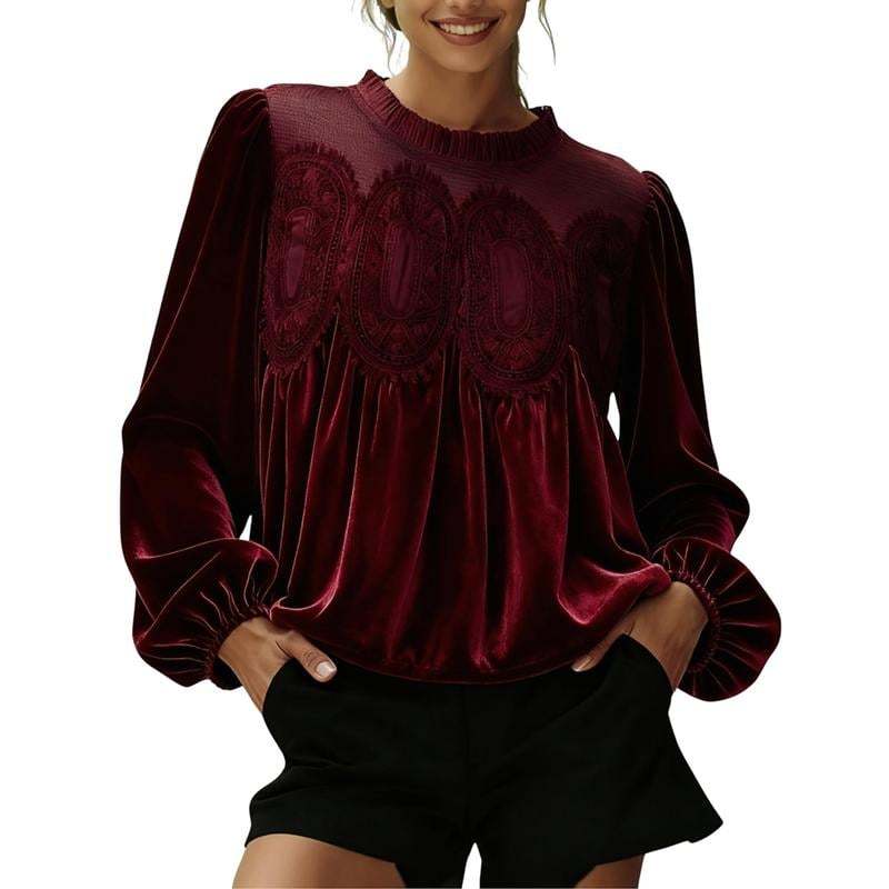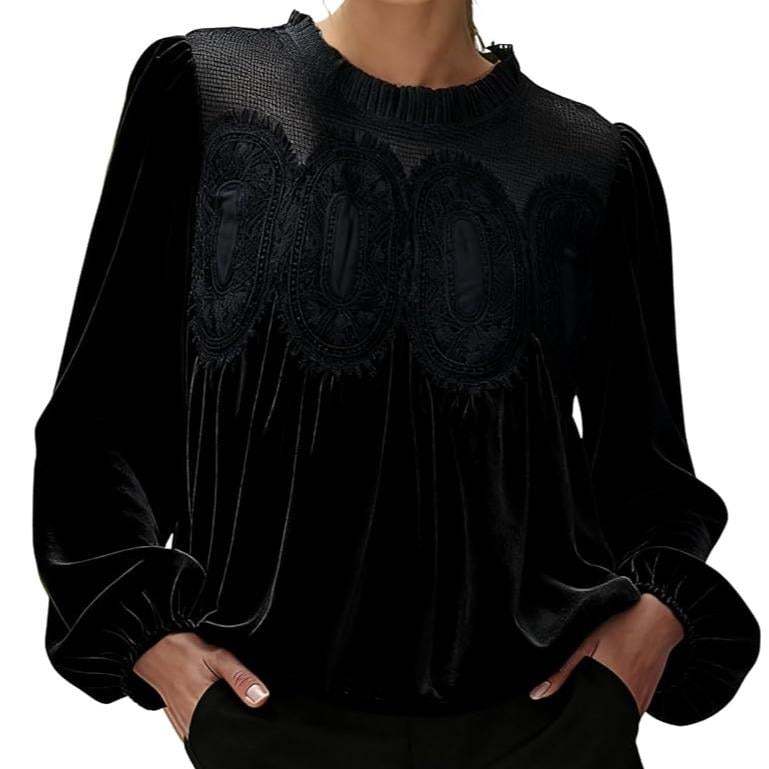 Women's Long Sleeve Velvet Trim Lace Blouse Elegant Flared Swing Top Round Neck Blouse Casual Wear[Buy 2 Free Shipping]