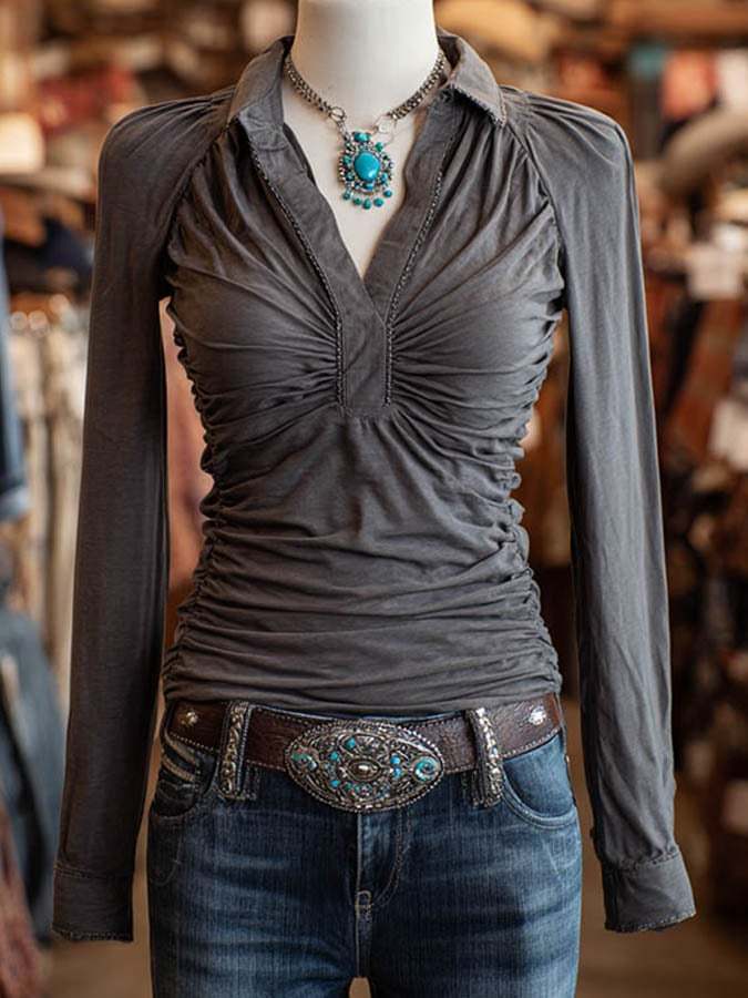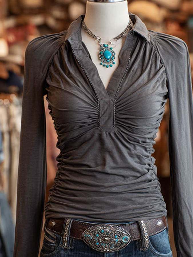 Women's Retro Lapel Shirred Top