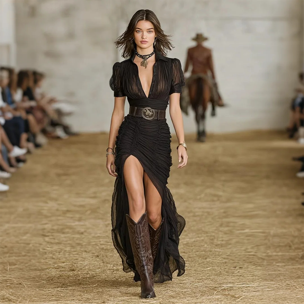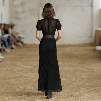 Step into sophistication and allure with the Women's Vintage Elegant Black Sheer Dress With High Slit. Featuring a flowing sheer fabric, high slit, ruched detailing, and a belted waistline, this dress is perfect for fashion shows, cocktail parties, and evening events. Its puff sleeves add a modern yet timeless charm, ensuring you make a statement wherever you go.