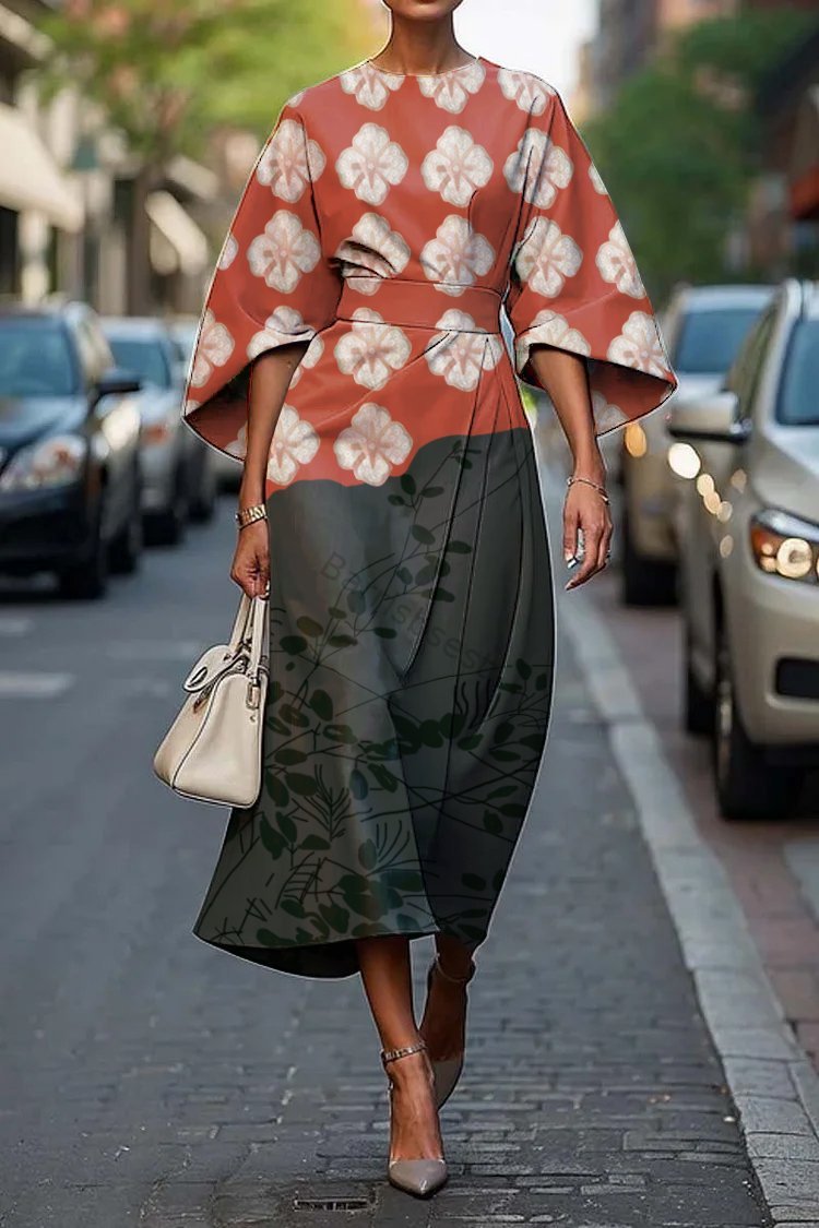 Women's Vintage Elegant Japanese Floral Print Midi Dress