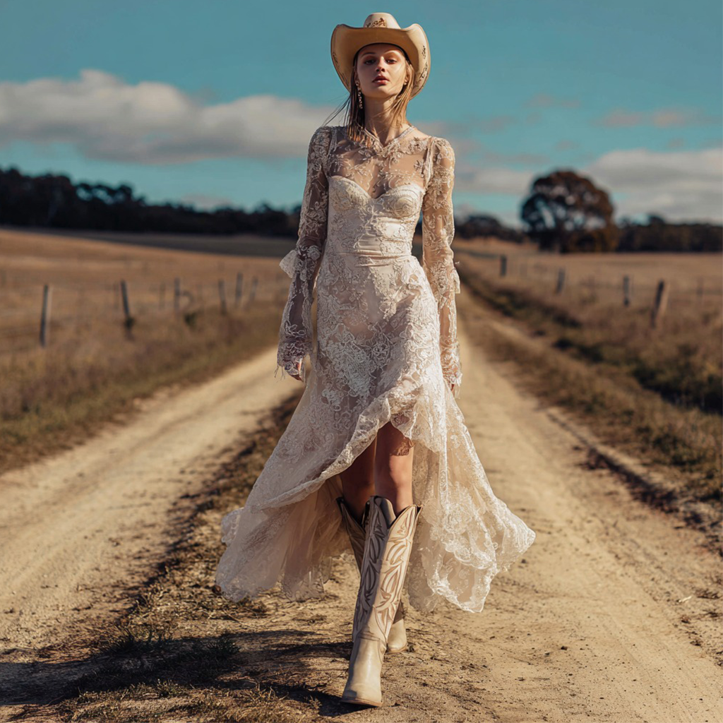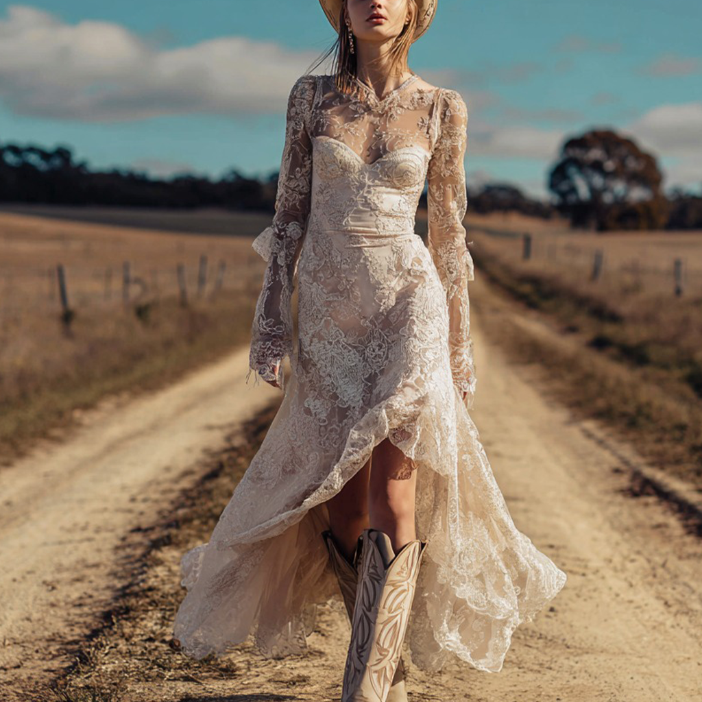 This vintage-inspired lace gown perfectly blends romantic sophistication with Western charm. Featuring a high-low hemline, intricate lace details, and long sleeves, it creates a flattering silhouette while moving gracefully with every step. Ideal for weddings, bridal showers, or country-themed events. 🌿